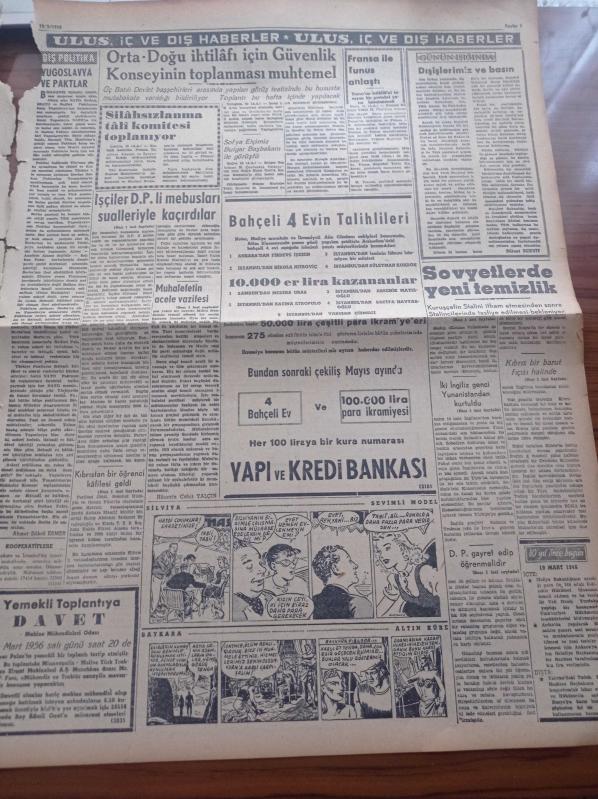 Ulus Gazetesi - 19 Mart 1956 - Bütün Millet Cumhuriyet Halk Parti'lilere Dert Yanıyor - Hüseyin Cahit Yalçın - Başbakan Adnan Menderes'in Başkanlığında Türk Heyeti Pakistan'da - İşçi Sendikaları Grev Hakkı Tanınmalı İkramiye Verilmelidir - İşçiler Demokrat Partili Mebusları Sualleriyle Kaçırdılar - Osman Bölükbaşı Adnan Menderes'i İtham Ediyor - Gençlerbirliği Hadiseli Geçen Maçı Kazandı - Ankara Milletvekillerinden Şeref Kamil Mengü Dün Vefat Etti - Kıbrıs Bir Barut Fıçısı Halinde - Din Konusu Ve Atatürk - Yedi Kızlar Yazan Georges Simenon Yazı Dizisi - Çanakkale Zaferi Anıldı - Orta Doğu İhtilafı İçin Güvenlik Konseyinin Toplanması Muhtemel - Fransa İle Tunus Anlaştı - Kruşçef'in Stalin'i İtham Etmesinden Sonra Stalincilerinde Tasfiye Edilmesi Bekleniyor - Piyale Makarnası - Muhabank - Sana Nebati Margarin - Ölüm Deresi Filmi Ulus Sinemasında - Fikret Hakan - Nevin Alpay - Cebeci Sineması adlı eser, Kitap > Süreli Yayınlar > Gazeteler > Türkiye > Genel > Günlük kategorisinde İkinci El olarak satıştadır.
