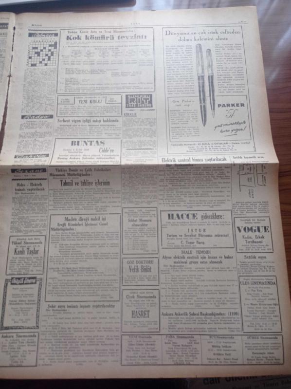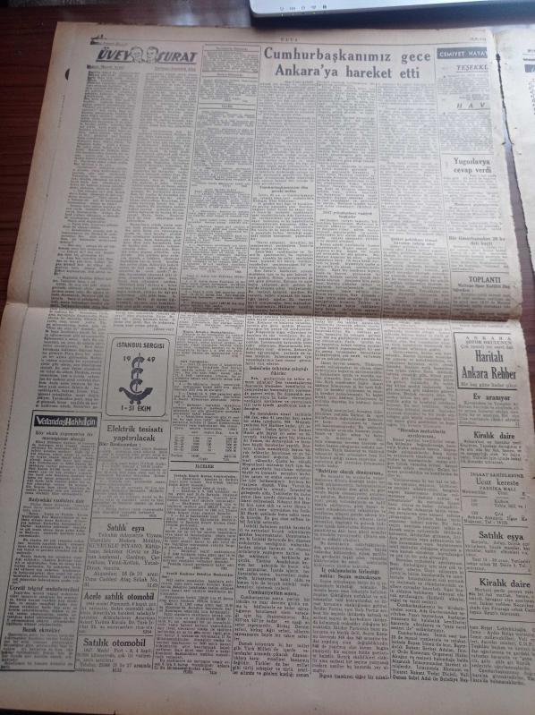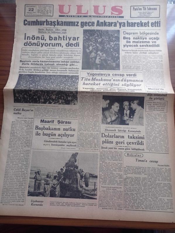 Ulus Gazetesi - 22 Aralık 1949 - Cumhurbaşkanımız İsmet İnönü Gece Ankara'ya Hareket Etti - Celal Bayar'ın Nutku - Hüseyin Cahit Yalçın - Maarif Şurası Başbakan Şemsettin Günaltay'ın Nutku İle Bugün Açılıyor - Tito Moskova'nın Düşmanca Hareket Ettiğini Söylüyor - Doğuda Deprem Bölgesinde Beş Nakliye Uçağı İle Malzeme Ve Yiyecek Sevkedildi - Peyami Safa Köşe Yazısı - İstanbul'dan Dönen Russell Dorr Gazetecilerle Görüşüyor - Esat Tekeli - Krilov'un Hatıraları - Feridun Osman Menteşeoğlu - Kerim Ömer Çağlar - Suriye'de Seçim Yenilenecek - Üvey Surat Yazan Marcel Ayme Yazı Dizisi - Cemiyet Hayatı - Parker 51 Dolmakalem - Tek Erkekler Tenis Birincisi Schröder - Lig Maçlarının Ana Meselesi - Dünya Olimpiyat Türkiye Rekorları - Fenerbahçe Demirspor'u İstanbul'a Çağırdı - Atletlerimiz İyi Neticeler Aldılar - Ferit Karslı adlı eser, Kitap > Süreli Yayınlar > Gazeteler > Türkiye > Genel > Günlük kategorisinde İkinci El olarak satıştadır.