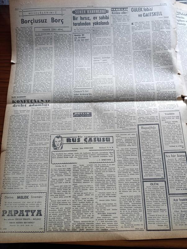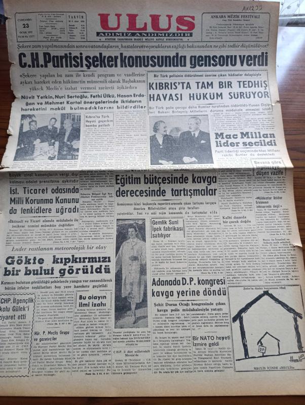 Ulus Gazetesi - 23 Ocak 1957 - Cumhuriyet Halk Partisi Şeker Konusunda Gensoru Verildi - Kıbrıs'ta Bir Türk Polisinin Öldürülmesi Üzerine Çıkan Hadiseler - Macmillan Lider Seçildi - İstanbul Ticaret Odasında Milli Korunma Kanunu da Tenkidler en Uğradı - Ender Rastlanan Meteorolojik Bir Olay Gökte Kıpkırmızı Bir Bulut Görüldü - Eğitim Bütçesinde Kavga Derecesinde Tartışmalar - Prenses Grace Kelly'nin Bebeğine Bakmak İçin Gelen Margaret Stahl - Konfüçyüs Ve Devlet Adamlığı Yazan Suphi Uzunca - Bir Zamanlar Rus Casusu İdim Anlatan Jean Sprecher Yazı Dizisi - İsrail Sina'yı Boşaltıyor - Sibirya Mahkumları Yazan Slavomir Rawicz Yazı Dizisi - Ölen Kim Öldüren Kim Bulgar Casusu Selmanof'un Maceraları Yazı Dizisi - Benelux Kumarhanesi - Galatasaray Fenerbahçe Basket Mücadelesi - Puşkaş Macaristana Dönecekmiş - Fenerbahçe Bugün İkinci Devreye Başlıyor - Galatasaray Ankaralılara Teşekkür Ediyor - Fay Temizleme Tozu - İstanbul Maçlarında Ankaralı Hakemler, Kasım Gülek tarafından kaleme alınmıştır. Ulus Gazetesi - 23 Ocak 1957 - Cumhuriyet Halk Partisi Şeker Konusunda Gensoru Verildi - Kıbrıs'ta Bir Türk Polisinin Öldürülmesi Üzerine Çıkan Hadiseler - Macmillan Lider Seçildi - İstanbul Ticaret Odasında Milli Korunma Kanunu da Tenkidler en Uğradı - Ender Rastlanan Meteorolojik Bir Olay Gökte Kıpkırmızı Bir Bulut Görüldü - Eğitim Bütçesinde Kavga Derecesinde Tartışmalar - Prenses Grace Kelly'nin Bebeğine Bakmak İçin Gelen Margaret Stahl - Konfüçyüs Ve Devlet Adamlığı Yazan Suphi Uzunca - Bir Zamanlar Rus Casusu İdim Anlatan Jean Sprecher Yazı Dizisi - İsrail Sina'yı Boşaltıyor - Sibirya Mahkumları Yazan Slavomir Rawicz Yazı Dizisi - Ölen Kim Öldüren Kim Bulgar Casusu Selmanof'un Maceraları Yazı Dizisi - Benelux Kumarhanesi - Galatasaray Fenerbahçe Basket Mücadelesi - Puşkaş Macaristana Dönecekmiş - Fenerbahçe Bugün İkinci Devreye Başlıyor - Galatasaray Ankaralılara Teşekkür Ediyor - Fay Temizleme Tozu - İstanbul Maçlarında Ankaralı Hakemler adlı eser Türkçe dilindedir.