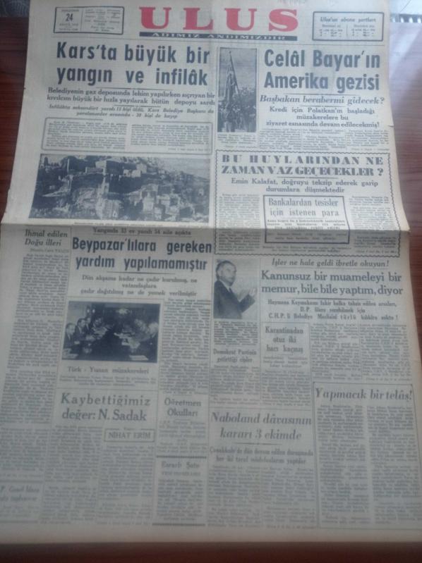 Ulus Gazetesi - 24 Eylül 1953 - Kars'ta Büyük Bir Yangın Ve İnfilak - Hüseyin Cahit Yalçın - Beypazarı Yangınında 33 Ev Yandı 54 Aile Açıkta - Nihat Erim Köşe Yazısı - Naboland Davasının Kararı 3 Ekim'de - Karantina'dan Otuz İki Hacı Kaçmış - Namık Zeki Aral - Silviya Şark Saraylarında - Hüsamettin Tugaç - Birleşmiş Milletler'de Amerika Kore İçin Tavizde Bulundu - Arapça Ders Veren Bakkal - Cumhurbaşkanı Celal Bayar İstanbul'a Gitti - İhmal Edilen Doğu İlleri - Fenerbahçe Ankara'ya Tam Kadro Geliyor - Amerika'nın En Müthiş Banka Soyguncusu Aktör Willie'nin Maceraları Yazı Dizisi - Ulus'un Resimli Romanı İçimizdeki Düşman - Kaybettiğimiz Değer Necmettin Sadak- Emet'teki Pikap Kimin Hizmetinde - Tenis Turnuvasında Özfenerbahçe Kupası - Fenerbahçe'nin Asker Oyuncularına İzin Verildi - Lefter Küçükandonyadis - Derman Ağrı Kesici - Ulus'un Hikayesi Bunak Yazan Selami İzzet Sedes, Kasım Gülek tarafından kaleme alınmıştır. Ulus Gazetesi - 24 Eylül 1953 - Kars'ta Büyük Bir Yangın Ve İnfilak - Hüseyin Cahit Yalçın - Beypazarı Yangınında 33 Ev Yandı 54 Aile Açıkta - Nihat Erim Köşe Yazısı - Naboland Davasının Kararı 3 Ekim'de - Karantina'dan Otuz İki Hacı Kaçmış - Namık Zeki Aral - Silviya Şark Saraylarında - Hüsamettin Tugaç - Birleşmiş Milletler'de Amerika Kore İçin Tavizde Bulundu - Arapça Ders Veren Bakkal - Cumhurbaşkanı Celal Bayar İstanbul'a Gitti - İhmal Edilen Doğu İlleri - Fenerbahçe Ankara'ya Tam Kadro Geliyor - Amerika'nın En Müthiş Banka Soyguncusu Aktör Willie'nin Maceraları Yazı Dizisi - Ulus'un Resimli Romanı İçimizdeki Düşman - Kaybettiğimiz Değer Necmettin Sadak- Emet'teki Pikap Kimin Hizmetinde - Tenis Turnuvasında Özfenerbahçe Kupası - Fenerbahçe'nin Asker Oyuncularına İzin Verildi - Lefter Küçükandonyadis - Derman Ağrı Kesici - Ulus'un Hikayesi Bunak Yazan Selami İzzet Sedes adlı eser Türkçe dilindedir.