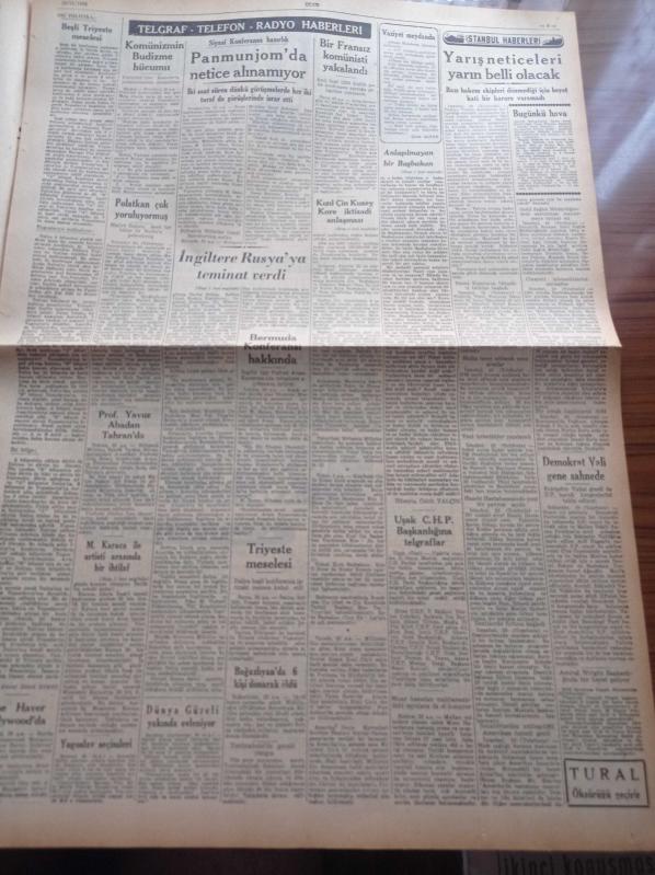 Ulus Gazetesi - 24 Kasım 1953 - Hüseyin Cahit Yalçın - İngiliz Dışişleri Bakanı Eden İran'a Bir Mesaj Gönderdi - Trabzon'da CHP'nin Başbakan Adnan Menderes'e Cevabı Kızıl Çin'le Kuzey Kore İktisadi Anlaşma Yaptı - Muammer Karaca İle Artisti Güzin İpek Arasında Bir İhtilaf - Fransız Polisine Tam 1,5 Yıl Meydan Okuyan Adam Dominici - Tek Yıldız İmzasını Kullanan Samet Ağaoğlu Suçüstü Yakalanmıştır - Güzel Gözlü Yosma Yazan Pierre Decourcelle Yazı Dizisi - Maliye Bakanı Hasan Polatkan Çok Yoruluyormuş - Dünya Güzeli Christian Martel Yakında Evleniyormuş - Yunanlı Rejisör Takis Musenidis Neler Anlatıyor - İspanyol Musikisinin Elçisi Joaquin Rodrigo - Turist Otel Pavyonu - Milli Takımımızın Tesbiti Meselesi - Gol Kralı Kupamız - Cenubi Amerika Ses Yıldızı Alda Regis, Kasım Gülek tarafından kaleme alınmıştır. Ulus Gazetesi - 24 Kasım 1953 - Hüseyin Cahit Yalçın - İngiliz Dışişleri Bakanı Eden İran'a Bir Mesaj Gönderdi - Trabzon'da CHP'nin Başbakan Adnan Menderes'e Cevabı Kızıl Çin'le Kuzey Kore İktisadi Anlaşma Yaptı - Muammer Karaca İle Artisti Güzin İpek Arasında Bir İhtilaf - Fransız Polisine Tam 1,5 Yıl Meydan Okuyan Adam Dominici - Tek Yıldız İmzasını Kullanan Samet Ağaoğlu Suçüstü Yakalanmıştır - Güzel Gözlü Yosma Yazan Pierre Decourcelle Yazı Dizisi - Maliye Bakanı Hasan Polatkan Çok Yoruluyormuş - Dünya Güzeli Christian Martel Yakında Evleniyormuş - Yunanlı Rejisör Takis Musenidis Neler Anlatıyor - İspanyol Musikisinin Elçisi Joaquin Rodrigo - Turist Otel Pavyonu - Milli Takımımızın Tesbiti Meselesi - Gol Kralı Kupamız - Cenubi Amerika Ses Yıldızı Alda Regis adlı eser Türkçe dilindedir.