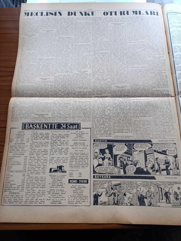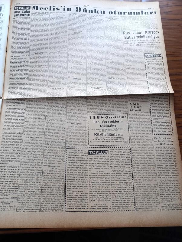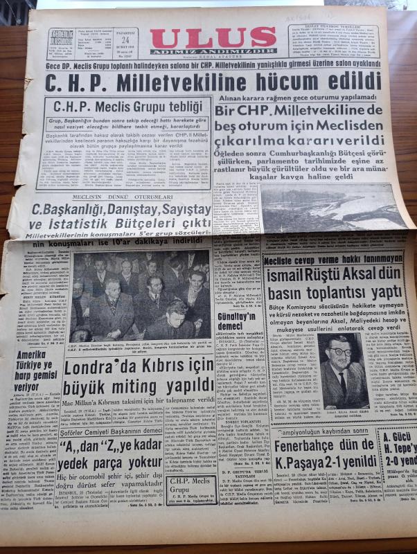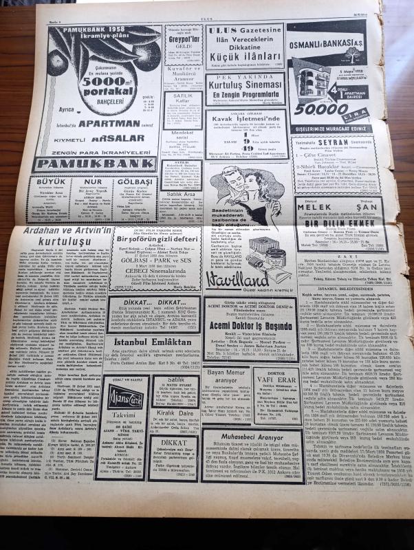 Ulus Gazetesi - 24 Şubat 1958 - Meclis'te Cumhuriyet Halk Partisi Milletvekiline Hücum Edildi- İsmail Rüştü Aksal Dün Basın Toplantısı Yaptı - Cumhuriyet Halk Partisi Meclis Grubu Tebliği - Londra'da Kıbrıs İçin Büyük Miting Yapıldı - Cumhurbaşkanlığı Danıştay Sayıştay Ve İstatistik Bütçeleri Çıktı - Amerika Türkiye Ve Harp Gemisi Veriyor - Fenerbahçe Dün Kasımpaşa'ya Yenildi - Şoförler Cemiyeti Başkanının Demeci A,dan Z'ye Kadar Yedek Parça Yoktur - Karapürçek Yazan M. Sunullah Arısoy Yazı Dizisi - Ardahan Ve Artvin'in Kurtuluşu Yazan Şevki Berker - Viyolonsel Resitali Yarın - Tarihte Bugün Osman Hamdi Bey'in Ölümü - Rus Lideri Kruşçev Batıyı Tehdit Ediyor - Tokat Milletvekili Şahap Kitapçının Konuşmaları - Diyanet İşleri Bütçesi - Ankara İstanbul Radyosu Programı - Silviya Kabiliyet Avcısı Çizgi Roman - Baykara Attila'nın Sesi Çizgi Roman - Osmanlı Bankası - Pamukbank - Havilland Krem - Kurtuluş Sineması - Bir Avuç Toprak Filmi Başrolde Ayhan Işık - Günün Kadını Filmi, Kasım Gülek tarafından kaleme alınmıştır. Ulus Gazetesi - 24 Şubat 1958 - Meclis'te Cumhuriyet Halk Partisi Milletvekiline Hücum Edildi- İsmail Rüştü Aksal Dün Basın Toplantısı Yaptı - Cumhuriyet Halk Partisi Meclis Grubu Tebliği - Londra'da Kıbrıs İçin Büyük Miting Yapıldı - Cumhurbaşkanlığı Danıştay Sayıştay Ve İstatistik Bütçeleri Çıktı - Amerika Türkiye Ve Harp Gemisi Veriyor - Fenerbahçe Dün Kasımpaşa'ya Yenildi - Şoförler Cemiyeti Başkanının Demeci A,dan Z'ye Kadar Yedek Parça Yoktur - Karapürçek Yazan M. Sunullah Arısoy Yazı Dizisi - Ardahan Ve Artvin'in Kurtuluşu Yazan Şevki Berker - Viyolonsel Resitali Yarın - Tarihte Bugün Osman Hamdi Bey'in Ölümü - Rus Lideri Kruşçev Batıyı Tehdit Ediyor - Tokat Milletvekili Şahap Kitapçının Konuşmaları - Diyanet İşleri Bütçesi - Ankara İstanbul Radyosu Programı - Silviya Kabiliyet Avcısı Çizgi Roman - Baykara Attila'nın Sesi Çizgi Roman - Osmanlı Bankası - Pamukbank - Havilland Krem - Kurtuluş Sineması - Bir Avuç Toprak Filmi Başrolde Ayhan Işık - Günün Kadını Filmi adlı eser Türkçe dilindedir.