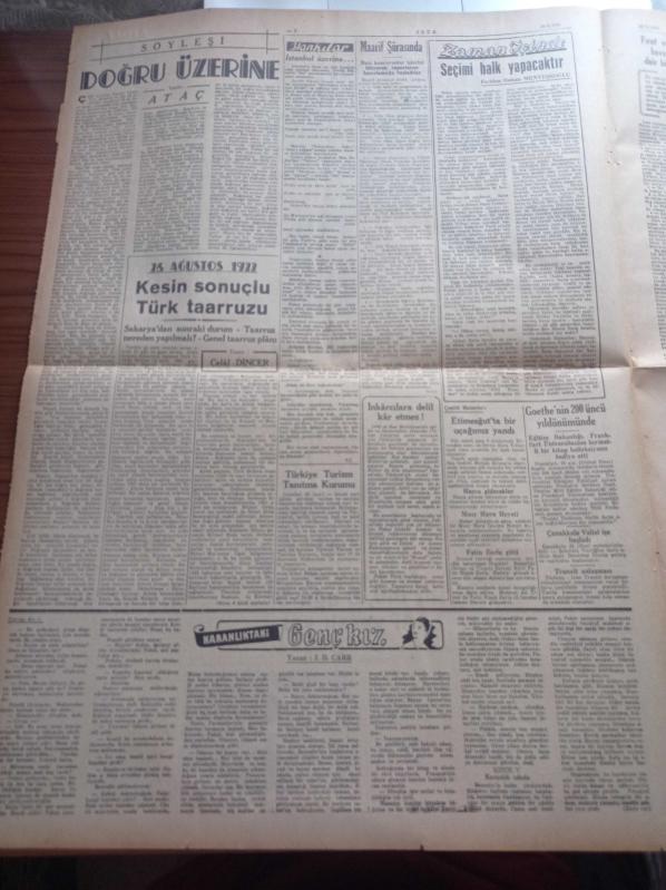 Ulus Gazetesi - 26 Ağustos 1949 - Bakanlar Kurulu İsmet İnönü'nün Başkanlığında Toplandı - Avrupa İstişare Meclisinde Türkiye Avrupa Birliği Fikrini Ciddiyetle Ele Alarak Çalışıyor - Hüseyin Cahit Yalçın - Peyami Safa Köşe Yazısı - Milli Oyunlar Ekibimiz İtalya'ya Gidiyor - Muzaffer Sarıözen - Suriye'nin Buğdayı Anlaşmaların Bozulduğu Haberi Dün Teyid Edildi - İstanbul Adalet Sarayı Projesi Müsabakası Dün Akşam Sona Erdi - 26 Ağustos 1922 Kesin Sonuçlu Türk Taarruzu - Goethe'nin 200. Yıldönümü - Amerika Tito'ya Güvenmiyor - Amerika Filistin İçin Bir Hal Çaresi Buldu - Rommel'in Son Günleri - Radyo İle Bir Evlenme Teklifi Yapıldı - Ping Pong Turnuvası - Gençlerbirliği Ordu Karması - Dünyanın En Garip Kadını Greta Garbo Tekrar Beyazperdeye Dönüyor - Truman'ın Kaç Tane Muhafızı Var - Uluslararası Türkiye Tenis Birincilikleri adlı eser, Kitap > Süreli Yayınlar > Gazeteler > Türkiye > Genel > Günlük kategorisinde İkinci El olarak satıştadır.