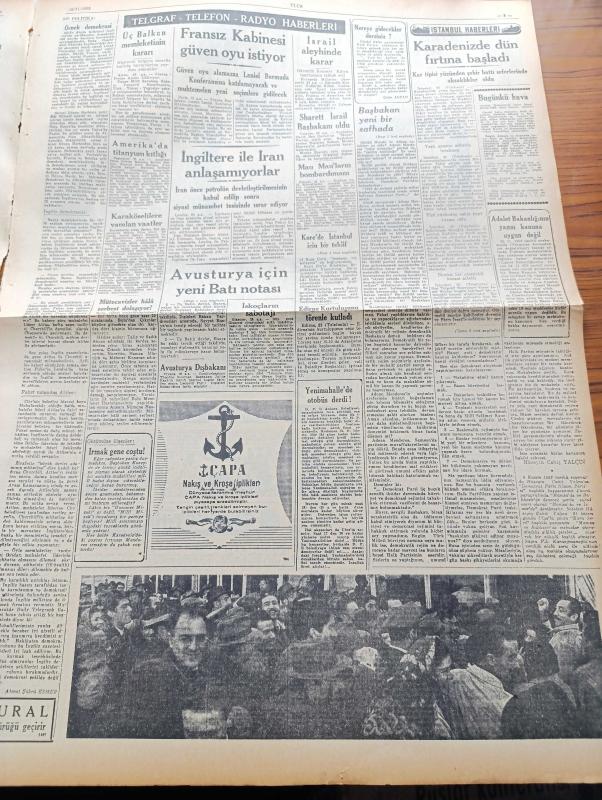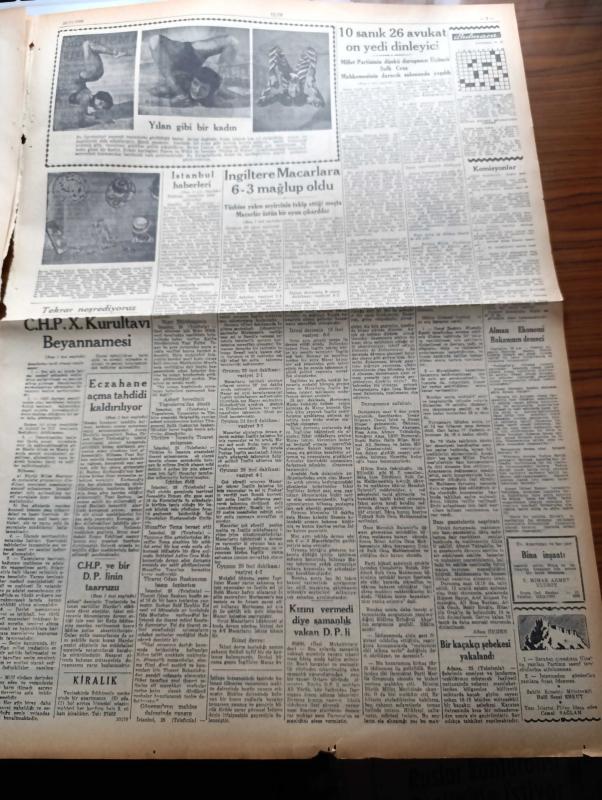 Ulus Gazetesi - 26 Kasım 1953 - CHP 10. Kurultayı Beyannamesi - Hüseyin Cahit Yalçın - Millet Partisi Dünkü Duruşmasında 10 Sanık 26 Avukat On Yedi Dinleyici - Nihat Erim - İngiltere Macaristan'a Dün 6 3 Mağlup Oldu - Kore'de İstanbul İçin Bir Teklif - Yunan Kralı Paul Teksas'ta - İsrail'in Kadın Başbakan Adayı Golda Myerson - İdamı İstenen Eski Irak Başbakanı Doktor Musaddık - Eczahane Açma Tahdidi Kaldırılıyor - Avusturya İçin Yeni Batı Notası - Güzel Gözlü Yosma Yazan Pierre Decourcelle Yazı Dizisi - Namık Zeki Aral - Saffet Arıkan'ın Ölüm Yıldönümü - İngiltere İle İran Anlaşamıyorlar - Çapa Nakış Ve Kroşe İplikleri - Sharett İsrail Başbakanı Oldu- Mau Mau'ların Bombardımanı - Müthiş Bir Cinayetin Hikayesi - Fenerbahçe Beşiktaş Maçının Hakemi İtalyan Carpani - Halit Ergönül Ringe Dönüyor - Baykara'nın Serüvenleri Gecenin Kanatları Çizgi Roman - Dedektif Bil Morton Esrarlı Şato Çizgi Roman - Yılan Gibi Kadın Rosie Llanos- Kör Bir Kadının Hayatı Yazı Dizisi - Petter Fielding Motor adlı eser, Kitap > Süreli Yayınlar > Gazeteler > Türkiye > Genel > Günlük kategorisinde İkinci El olarak satıştadır.