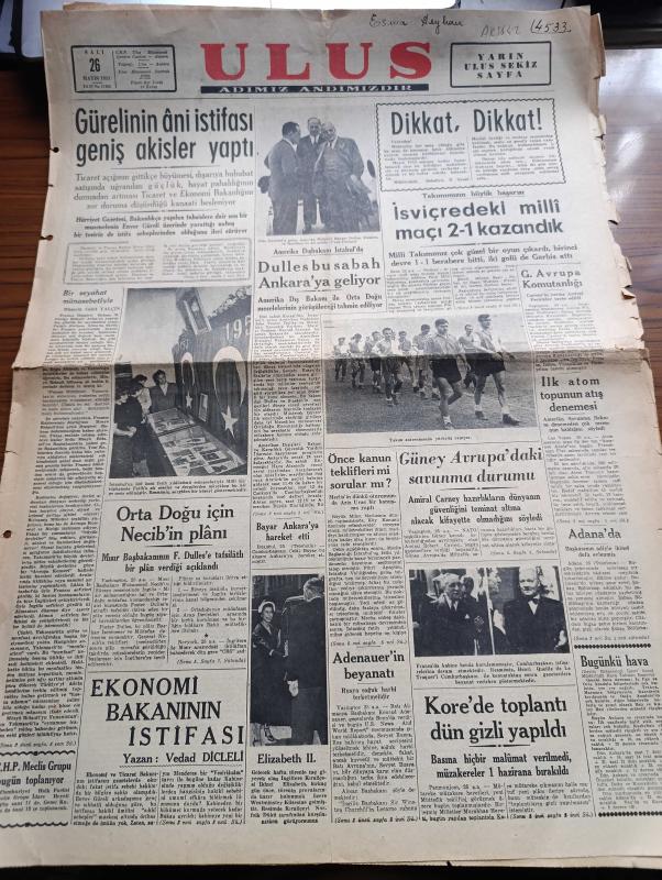 Ulus Gazetesi - 26 Mayıs 1953 - Bir Seyahat Münasebetiyle Yazan Hüseyin Cahit Yalçın Köşe Yazısı - Ekonomi Ve Ticaret Bakanı Enver Güreli'nin İstifası Geniş Akisler Yarattı - Amerika Dışbakanı John Foster Dulles Bu Sabah Ankara'ya Geliyor - İsviçre'deki Milli Maçı 2 1 Kazandık - Güney Avrupa Komutanlığına Carney Yerine Fechteler Tayin Edildi - Orta Doğu İçin Necib'in Planı - Ekonomi Bakanının İstifası Yazan Vedat Dicleli - Kore'de Toplantı Dün Gizli Yapıldı - Batı Almanya Başbakanı Adenauer'in Beyanatı - Unutulan Bir Tasarımı Yazan Avukat Profesör Doktor Faruk Erem Köşe Yazısı - Silviya'nın Aşk Okulu Çizgi Roman - Kaybolan Kızlar İpek Çorap Cinayetleri Yazan John Evans Yazı Dizisi - Gazi Eğitim Enstitüsünde Dünkü Tören - İtalyan Başbakanı De Gasperi Tito'ya Cevap Veriyor - Kahve Darlığı Baş Gösteriyor - Son Yüzyılın En Büyük İhaneti Bir Casusun Çaldığı Sırlar Yazan J.E. Hoover Yazı Dizisi - Ulus'un Resimli Romanı 461 Numaralı Mahzen - Bu Hafta Galatasaray Gelecek Mi - Ankaragücü, Halil Sezai Erkut tarafından kaleme alınmıştır. Ulus Gazetesi - 26 Mayıs 1953 - Bir Seyahat Münasebetiyle Yazan Hüseyin Cahit Yalçın Köşe Yazısı - Ekonomi Ve Ticaret Bakanı Enver Güreli'nin İstifası Geniş Akisler Yarattı - Amerika Dışbakanı John Foster Dulles Bu Sabah Ankara'ya Geliyor - İsviçre'deki Milli Maçı 2 1 Kazandık - Güney Avrupa Komutanlığına Carney Yerine Fechteler Tayin Edildi - Orta Doğu İçin Necib'in Planı - Ekonomi Bakanının İstifası Yazan Vedat Dicleli - Kore'de Toplantı Dün Gizli Yapıldı - Batı Almanya Başbakanı Adenauer'in Beyanatı - Unutulan Bir Tasarımı Yazan Avukat Profesör Doktor Faruk Erem Köşe Yazısı - Silviya'nın Aşk Okulu Çizgi Roman - Kaybolan Kızlar İpek Çorap Cinayetleri Yazan John Evans Yazı Dizisi - Gazi Eğitim Enstitüsünde Dünkü Tören - İtalyan Başbakanı De Gasperi Tito'ya Cevap Veriyor - Kahve Darlığı Baş Gösteriyor - Son Yüzyılın En Büyük İhaneti Bir Casusun Çaldığı Sırlar Yazan J.E. Hoover Yazı Dizisi - Ulus'un Resimli Romanı 461 Numaralı Mahzen - Bu Hafta Galatasaray Gelecek Mi - Ankaragücü adlı eser Türkçe dilindedir.