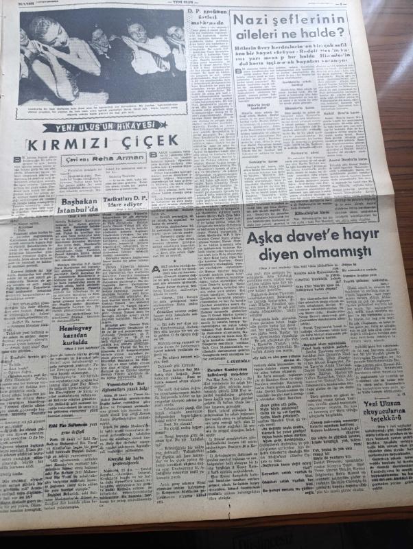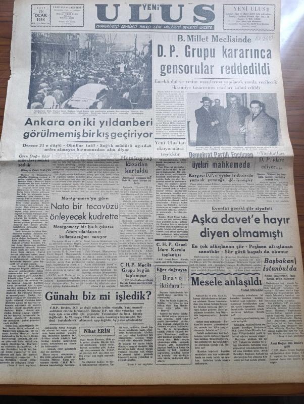Ulus Gazetesi - 26 Ocak 1954 - Hüseyin Cahit Yalçın Köşe Yazısı - Ankara On İki Yıldan Beri Görülmemiş Bir Kış Geçiriyor - Büyük Millet Meclisi'nde Demokrat Parti Kararınca Gensorular Reddedildi - Amerikalı Romancı Ernest Hemingway Uçak Kasasından Kurtuldu - Montgomery'ye Göre NATO Bir Tecavüzü Önleyecek Kudrette - Tarikatları Demokrat Parti İdare Ediyor - Başbakan Adnan Menderes İstanbul'da - Edebiyat Derneği Sanatseverleri Aşka Davet Etti - Eskimolar Çeviren Rahşan Ecevit - Hitler Beceremedikten Sonra Yazan Kemal Zeki Gençosman - Unlu Maddeler Sendikasının Beyannamesi - İstanbul'da Ruhban Mektebi Törenle Açıldı - Komünist İşçili Fabrikalar - Laos'ta Fransızlar Duruma Hakim - Kaybettiğimiz Değerli Sanatkar Perihan Yenal'ın En Sevdiği Resimi - Pasifik Kahramanları Anlatan Ronald Mckie Yazı Dizisi - Yeni Ulus'un Hikayesi Kırmızı Çiçek Çeviren Reha Arman - Nazi Şeflerinin Aileleri Ne Halde - Beşiktaş İle Karşılaşamayan Adaletin Tam Kadrosu Fotoğrafı - Ankaragücü Karagücü Yenişemediler, Nihat Erim tarafından kaleme alınmıştır. Ulus Gazetesi - 26 Ocak 1954 - Hüseyin Cahit Yalçın Köşe Yazısı - Ankara On İki Yıldan Beri Görülmemiş Bir Kış Geçiriyor - Büyük Millet Meclisi'nde Demokrat Parti Kararınca Gensorular Reddedildi - Amerikalı Romancı Ernest Hemingway Uçak Kasasından Kurtuldu - Montgomery'ye Göre NATO Bir Tecavüzü Önleyecek Kudrette - Tarikatları Demokrat Parti İdare Ediyor - Başbakan Adnan Menderes İstanbul'da - Edebiyat Derneği Sanatseverleri Aşka Davet Etti - Eskimolar Çeviren Rahşan Ecevit - Hitler Beceremedikten Sonra Yazan Kemal Zeki Gençosman - Unlu Maddeler Sendikasının Beyannamesi - İstanbul'da Ruhban Mektebi Törenle Açıldı - Komünist İşçili Fabrikalar - Laos'ta Fransızlar Duruma Hakim - Kaybettiğimiz Değerli Sanatkar Perihan Yenal'ın En Sevdiği Resimi - Pasifik Kahramanları Anlatan Ronald Mckie Yazı Dizisi - Yeni Ulus'un Hikayesi Kırmızı Çiçek Çeviren Reha Arman - Nazi Şeflerinin Aileleri Ne Halde - Beşiktaş İle Karşılaşamayan Adaletin Tam Kadrosu Fotoğrafı - Ankaragücü Karagücü Yenişemediler adlı eser Türkçe dilindedir.