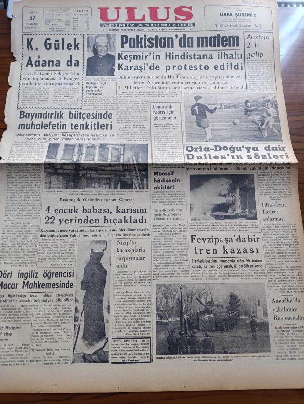 Ulus Gazetesi - 27 Ocak 1957 - Saman Yüklü Kağnı Yazan Fikret Otyam Yazı Dizisi- Pakistan'da Matem Nehru'nun Resimleri Yakıldı - Nizip'te Kaçakçılarla Çarpışmalar Oldu - Ortadoğu'ya Dair Amerikan Dışbakanı Dulles'in Sözleri - Türk İran Ticaret Anlaşması - Amerika'da Yakalanan Rus Casusları - Yakup Kadri Karaosmanoğlu Yazı Dizisi -73 Yaşına Basan Bir İrfan Yuvası İstanbul Erkek Lisesi - Birleşmiş Milletler Genel Sekreterinin Raporu İsrail'i Memnun Etmedi - Buğday Bankası - Yapı Ve Kredi Bankası - Şekerbank - Kral Suud Amerika Yolunda - Silviya Yüzme Havuzunda Çizgi Roman - Baykara Hz. Süleymanın Taşı Çizgi Roman -Çehov'dan Bir Hikaye Çeviren Leyla Dursunoğlu - Austria'lılar Dün Demirspor'u 2 1 Yendi - Bükreş Karması Dün İzmir'de Galip - Galatasaray Dün Liderliği Kaybetti - Fenerbahçe'nin Ve Milli Takımın Yemek Direği Dev Basketbolcu Altan Dinçer - Zeki Müren'in Eşsiz Eseri Berduş Büyük Ve Nur Sinemalarında - Cavga Dans Öğretim Stüdyosu - Yenişehir Ve Keçiören Galip - Ankara Karması, Kasım Gülek tarafından kaleme alınmıştır. Ulus Gazetesi - 27 Ocak 1957 - Saman Yüklü Kağnı Yazan Fikret Otyam Yazı Dizisi- Pakistan'da Matem Nehru'nun Resimleri Yakıldı - Nizip'te Kaçakçılarla Çarpışmalar Oldu - Ortadoğu'ya Dair Amerikan Dışbakanı Dulles'in Sözleri - Türk İran Ticaret Anlaşması - Amerika'da Yakalanan Rus Casusları - Yakup Kadri Karaosmanoğlu Yazı Dizisi -73 Yaşına Basan Bir İrfan Yuvası İstanbul Erkek Lisesi - Birleşmiş Milletler Genel Sekreterinin Raporu İsrail'i Memnun Etmedi - Buğday Bankası - Yapı Ve Kredi Bankası - Şekerbank - Kral Suud Amerika Yolunda - Silviya Yüzme Havuzunda Çizgi Roman - Baykara Hz. Süleymanın Taşı Çizgi Roman -Çehov'dan Bir Hikaye Çeviren Leyla Dursunoğlu - Austria'lılar Dün Demirspor'u 2 1 Yendi - Bükreş Karması Dün İzmir'de Galip - Galatasaray Dün Liderliği Kaybetti - Fenerbahçe'nin Ve Milli Takımın Yemek Direği Dev Basketbolcu Altan Dinçer - Zeki Müren'in Eşsiz Eseri Berduş Büyük Ve Nur Sinemalarında - Cavga Dans Öğretim Stüdyosu - Yenişehir Ve Keçiören Galip - Ankara Karması adlı eser Türkçe dilindedir.
