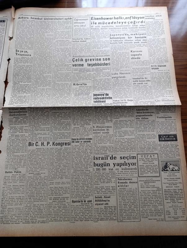 Ulus Gazetesi - 3 Kasım 1959 - Şa Şa Şa Triumvira Yakup Kadri Karaosmanoğlu Köşe Yazısı - Değerli Sanatkar Halide Pişkin Toprağa Verildi - İstanbul Üniversitesi Rektörü Sıddık Sami Onar İlim Siyasetin Emrinde Değildir Dedi - Ankara Ve İstanbul Üniversiteleri Açıldı - İsmet İnönü Ve İsmail Rüştü Aksal Osman Bölükbaşı'nı Ziyaret Etti - Kıbrıs'ta İhtilaf Konusu Olan Anayasaya İçin Çalışmalara Başlandı - Maden İşçileri Sendikası - Uluslararası Dolandırıcı Bruno Przetak Hakkında 7 Kişi Daha Dün Savcılığa Müracaat Etti - Milli Türk Talebe Birliği Kongresinde Tartışmalar - Nükleer Silah Denemelerinin Durdurulması - Gölbaşında Amerikan Şirketinde Çalışan 550 Türk İşçi Toplu Halde İşten Çıkarıldı - Amerikan Şirketi Tarafından İşten Çıkarılan 550 İşçinin 350'si Sessiz Gösterisini Polis Dağıttı - Kumsalda Çeviren Bilge Karasu Yazı Dizisi - Başlar Ve Ayaklar Yazan Salahattin Hakkı Esatoğlu - Sahne Yazan Metin And - Emil Galip Sandalcı - Fas'taki Amerika'nın Üslerinin Tahliyesi -Rockfeller Tesisi adlı eser, Kitap > Süreli Yayınlar > Gazeteler > Türkiye > Genel > Günlük kategorisinde İkinci El olarak satıştadır.
