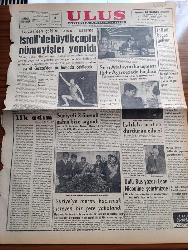 Ulus Gazetesi - 6 Mart 1957 - Devletkuşu Yazan Orhan Kemal Yazı Dizisi - Hüseyin Cahit Yalçın - İsrail Gazze'den Üç Haftada Çekilecek - İsrail'de Büyük Çapta Nümayişler Yapıldı - Suriyeli 2 Önemli Şahıs Hasan El Atraş ile Salah Çiçekli Bize Sığındı - Sırrı Atalay'ın Duruşması Iğdır Ağır Ceza'da Başladı - Süreyya Babür'ün İcat Ettiği Islıkla Motor Durduran Cihaz - Oktay Engin Selanikte Gıyaben Yargılanıyor - Ünlü Rus Yazarı Nicouline Ankara'da - CHP Genel Başkanı İsmet İnönü - Doktor Rebii Barkın'ın Broşürü Savcılık Tarafından Toplatıldı - Delilsiz İsnatlar Yazan Doçent Doktor Muammer Aksoy - Tanınmış Bir Kanser Uzmanı Evarts A. Graham Öldü - Canlı Köşkün Esrarı Yazan Bülent Ecevit - Migros'tan 30 Gram Kahve Almak İçin 10 Liralık Eşya Almak Şart - Yakup Kadri Karaosmanoğlu - Kazazedeler Adası Kefken - Cemal Nadir Güler - Silviya Kobay'ın Hikayesi Çizgi Roman - Baykara Hz. Süleyman Taşı Çizgi Roman - Ankara İstanbul Radyosu Programı - Galatasaray'ın Çetin Rakibi Adalet - Tülin Korman adlı eser, Kitap > Süreli Yayınlar > Gazeteler > Türkiye > Genel > Günlük kategorisinde İkinci El olarak satıştadır.