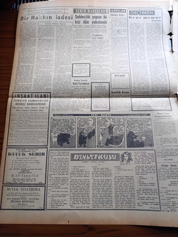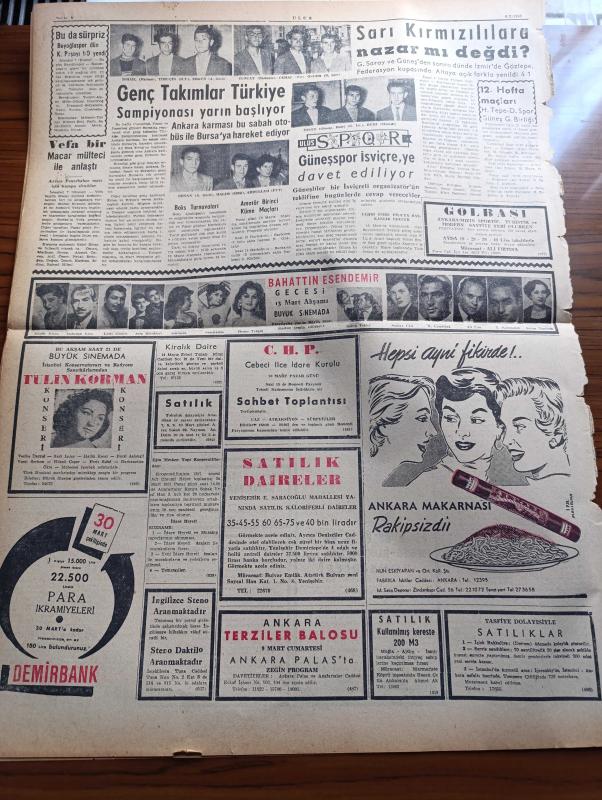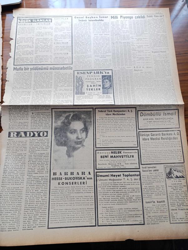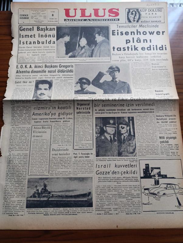 Ulus Gazetesi - 8 Mart 1957 - CHP Genel Başkanı İsmet İnönü İstanbul'da - Temsilciler Meclisinde Eisenhower Planı Tastik Edildi - E.O.K.A. İkinci Başkanı Gregoris Afxentu Dinamitle Nasıl Öldürüldü - İzmir Vapurunun Katili Hawel Lykes Amerika'ya Gidiyor - Gençlik Ve Fikir Ocaklarının Bir Seminerine İzin Verilmedi - İsrail Kuvvetleri Gazze'den Çekildi - Altıncı Filonun İstanbul'u Ziyareti - Devletkuşu Yazan Orhan Kemal Yazı Dizisi - Yeni Dünya Çizen Ferruh Doğan - Fransız Kuvvetleri 200 Cezayirli Daha Öldürdü - Yakup Kadri Karaosmanoğlu - Ahmet Şükrü Esmer - Senenin En Kuvvetli Komedisi Aşk Arabası Gölbaşı Sinemasında - Artvin 36 Yıl Önce Dün Kurtarılmıştı - Squibb İlaçları - Silviya Kobay'ın Hikayesi Çizgi Roman - Baykara Hz. Süleymanın Taşı - Barbara Hesse Bukowska'nın Konserleri - Yurdumuzun Medarı İftiharı Şahin Tekler Esenpark'ta - Sarı Kırmızı Takımlar Galatasaray Güneşspor Ve Göztepe'ye Nazar Mı Değdi - Vefa Stefan Kremen İsimli Bir Macar Mülteci İle Anlaştı - Sevim Tanürek, Kasım Gülek tarafından kaleme alınmıştır. Ulus Gazetesi - 8 Mart 1957 - CHP Genel Başkanı İsmet İnönü İstanbul'da - Temsilciler Meclisinde Eisenhower Planı Tastik Edildi - E.O.K.A. İkinci Başkanı Gregoris Afxentu Dinamitle Nasıl Öldürüldü - İzmir Vapurunun Katili Hawel Lykes Amerika'ya Gidiyor - Gençlik Ve Fikir Ocaklarının Bir Seminerine İzin Verilmedi - İsrail Kuvvetleri Gazze'den Çekildi - Altıncı Filonun İstanbul'u Ziyareti - Devletkuşu Yazan Orhan Kemal Yazı Dizisi - Yeni Dünya Çizen Ferruh Doğan - Fransız Kuvvetleri 200 Cezayirli Daha Öldürdü - Yakup Kadri Karaosmanoğlu - Ahmet Şükrü Esmer - Senenin En Kuvvetli Komedisi Aşk Arabası Gölbaşı Sinemasında - Artvin 36 Yıl Önce Dün Kurtarılmıştı - Squibb İlaçları - Silviya Kobay'ın Hikayesi Çizgi Roman - Baykara Hz. Süleymanın Taşı - Barbara Hesse Bukowska'nın Konserleri - Yurdumuzun Medarı İftiharı Şahin Tekler Esenpark'ta - Sarı Kırmızı Takımlar Galatasaray Güneşspor Ve Göztepe'ye Nazar Mı Değdi - Vefa Stefan Kremen İsimli Bir Macar Mülteci İle Anlaştı - Sevim Tanürek adlı eser Türkçe dilindedir.