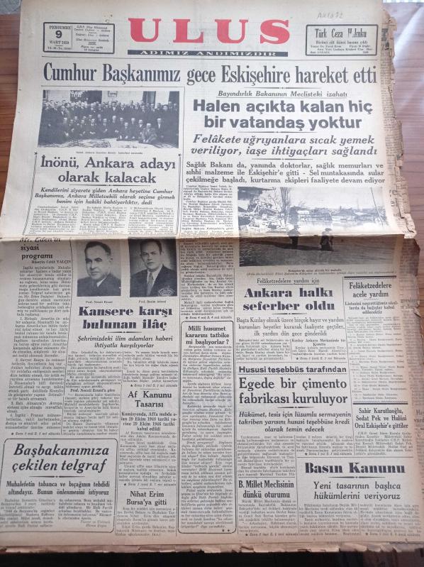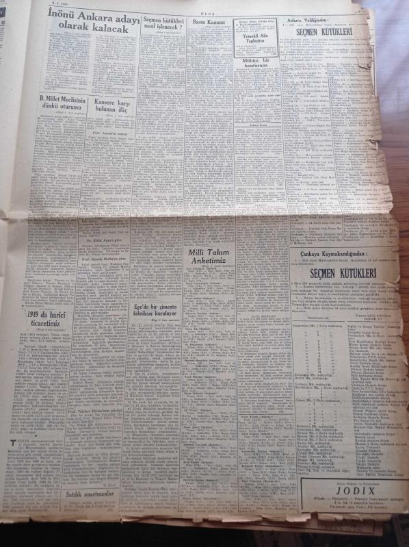 Ulus Gazetesi - 9 Mart 1950 - Başbakan Şemsettin Günaltay -İsmet İnönü Ankara Adayı Olarak Kalacak - Cumhurbaşkanı İsmet İnönü Sel Felaketi Mağduru Eskişehir'e Hareket Etti - Bayındırlık Bakanı Şevket Adalan Halen Açıkta Kalan Bir Vatandaş Yoktur - Felaketlere Yardım İçin Ankara Halkı Seferber Oldu - Kansere Karşı Bulunan İlaç - Profesör Necati Eranıl - Profesör Rasim Adasal - Namık Zeki Aral - Feridun Osman Menteşeoğlu - Hemşire Nimet Yazan Azmiye Hami Güven Yazı Dizisi - Van Gölü İçin Gemi İnşa Ettirilecek - Milli Takım Atletimiz - Zehra Bilir Bomonti Aile Saz Salonunda- Erzurum Folklor Gecesi - Eskişehir Su Baskınından Resimler - Bulmaca - Radyo Bugünkü Program - Tarım Bakanı Cavit Oral Geldi - Seçmen Kütükleri Nasıl İşlenecek - 1949'da Harici Ticaretimiz - Nazilli'nin Üç Köyünde Muhtar Seçimini CHP'liler Kazandı, Kasım Gülek tarafından kaleme alınmıştır. Ulus Gazetesi - 9 Mart 1950 - Başbakan Şemsettin Günaltay -İsmet İnönü Ankara Adayı Olarak Kalacak - Cumhurbaşkanı İsmet İnönü Sel Felaketi Mağduru Eskişehir'e Hareket Etti - Bayındırlık Bakanı Şevket Adalan Halen Açıkta Kalan Bir Vatandaş Yoktur - Felaketlere Yardım İçin Ankara Halkı Seferber Oldu - Kansere Karşı Bulunan İlaç - Profesör Necati Eranıl - Profesör Rasim Adasal - Namık Zeki Aral - Feridun Osman Menteşeoğlu - Hemşire Nimet Yazan Azmiye Hami Güven Yazı Dizisi - Van Gölü İçin Gemi İnşa Ettirilecek - Milli Takım Atletimiz - Zehra Bilir Bomonti Aile Saz Salonunda- Erzurum Folklor Gecesi - Eskişehir Su Baskınından Resimler - Bulmaca - Radyo Bugünkü Program - Tarım Bakanı Cavit Oral Geldi - Seçmen Kütükleri Nasıl İşlenecek - 1949'da Harici Ticaretimiz - Nazilli'nin Üç Köyünde Muhtar Seçimini CHP'liler Kazandı adlı eser Türkçe dilindedir.