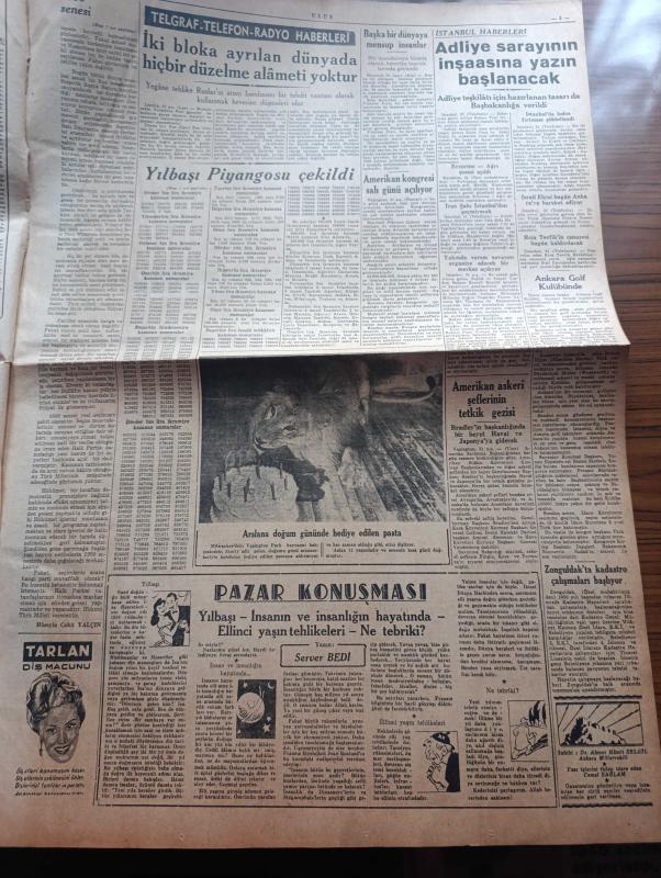 Ulus Gazetesi - Turkish Newspaper - 1 Ocak 1950 - 1950 senesi yazan Hüseyin Cahit Yalçın Başmakale - bu asrın gururu ve utancı yazan Peyami Safa - Başbakan Şemsettin Günaltay'ın İstanbul CHP kongresindeki nutku fotoğraf - Marshall planı Türkiye'de başarıyla tatbik ediliyor - Russell Dorr ilerleme Türk halkının da geniş işbirliğine ihtiyaç gösterecek dereceye geldi diyor fotoğraf - Merhum Mustafa Necati'nin ölüm yıldönümü - Yeni Yıl uğurlu olsun - Celal Bayar düşmanlık politikasını terk etmeyeceğini söylüyor - yılbaşı piyangosu dün akşam çekildi - 1950 yazan Falih Rıfkı Atay - pazar konuşması yazan Server Bedi - adliye sarayı'nın inşasına yazın başlanacak - Margaret Lockwood İle Norman Wooland hazin Aşk filminin bir sahnesinde Fotoğrafı - Perihan Altındağ Sözeri Bomonti aile saz salonunda - Safiye Ayla Bomonti Aile saz salonunda - tam 10 yıl önce Staline verilen hediyeler - taklit sanatın rekorunu kıran Cevat Kurtuluş küçük tiyatroda - Birinci devre lig maçlarının son karşılaşmaları adlı eser, Kitap > Süreli Yayınlar > Gazeteler > Türkiye > Genel > Günlük kategorisinde İkinci El olarak satıştadır.