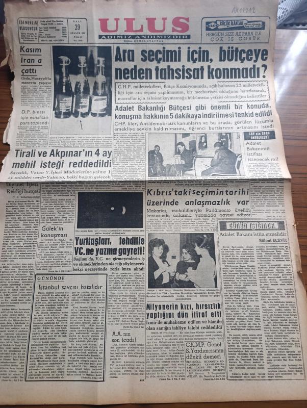 Ulus Gazetesi - Turkish Newspaper - 29 Aralık 1959 - diyanet İşleri reisliği bütçesi yazan Yakup Kadri Karaosmanoğlu Başmakale - Irak başbakanı General Kasım İran'a çattı - Arapça yazılan şişeler birçok gazino pavyon ve lokantalarda kullanılmaktadır fotoğraf - ara seçimi için bütçeye neden tahsisat konmadı - Selami Akpınar ve Naim Tirali için 4 ay mehil isteği reddedildi - yurttaşları tehditle Vatan Cephesine yazma gayreti - adalet bakanı istifa etmelidir yazan Bülent Ecevit - körler eğitimi ile ilgili sergi açıldı - kıbrıs'taki seçimin tarihi üzerinde anlaşmazlık var - kumsalda çeviren Bilge Karasu Yazı Dizisi - Diyarbakır Demokrat Parti teşkilatı içindeki huzursuzluk - içimizden ikisi yazan Emil Galip Sandalcı - pasif korunma dersi yerine CHP'ye küfür eden binbaşı Osman Nuri Dedeoğlu - acı sevda filmi başrolde Muhterem Nur ve Ahmet Tarık Tekçe Ulus sinemasında - şampiyon jokey Kazım Yıldız kupasının verilişini tenkit ediyor fotoğraf - mağlup edilmeyenler Beşiktaş - Ordu takımımız adlı eser, Kitap > Süreli Yayınlar > Gazeteler > Türkiye > Genel > Günlük kategorisinde İkinci El olarak satıştadır.