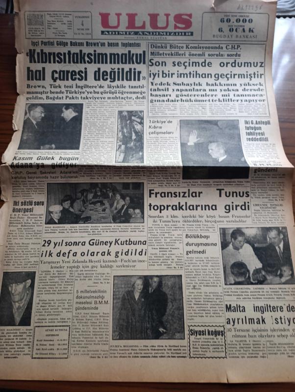 Ulus Gazetesi - Turkish Newspaper - 4 Ocak 1958 - İşçi Partisi gölge bakanı George Brown'un basın toplantısı Kıbrıs'ı taksim makul hal çaresi değildir - İşçi Partisi gölge bakanı George Brown Kasım Gülek'in evinden ayrılırken fotoğraf - Türkiye'de Kıbrıs çalışmaları - Fransızlar Tunus topraklarına girdi - Osman Bölükbaşı duruşmasına gelmedi - 29 yıl sonra Güney kutbuna ilk defa olarak gidildi - Ankara gazeteciler sendikasının balo hazırlığı fotoğraf - Shakespeare'in ünlü eseri ile canlanan veronalı aşık Juliet'in mezarı fotoğraf - Vatan Yolunda Milli mücadele hatıraları yazan Yakup Kadri Karaosmanoğlu Yazı Dizisi - Markizde Sevignenin kehaneti yazan Leyla Çambel - Kara tahtada ak yazı Hürriyet yazan Oktay Verel - Kıbrıs ve İşçi Partisi Yarın Ahmet Şükrü Esmer - Doğu çikolata fabrikası açıldı - siyasi koğuş yazan Örsan Öymen - Ankara İstanbul Radyosu Programı - futbol liginde 2. Devre başlıyor - Demirsporlar serbest güreş şampiyonası bugün saat 19.00'da başlayacak - Fenerbahçe basketbol, Kasım Gülek tarafından kaleme alınmıştır. Ulus Gazetesi - Turkish Newspaper - 4 Ocak 1958 - İşçi Partisi gölge bakanı George Brown'un basın toplantısı Kıbrıs'ı taksim makul hal çaresi değildir - İşçi Partisi gölge bakanı George Brown Kasım Gülek'in evinden ayrılırken fotoğraf - Türkiye'de Kıbrıs çalışmaları - Fransızlar Tunus topraklarına girdi - Osman Bölükbaşı duruşmasına gelmedi - 29 yıl sonra Güney kutbuna ilk defa olarak gidildi - Ankara gazeteciler sendikasının balo hazırlığı fotoğraf - Shakespeare'in ünlü eseri ile canlanan veronalı aşık Juliet'in mezarı fotoğraf - Vatan Yolunda Milli mücadele hatıraları yazan Yakup Kadri Karaosmanoğlu Yazı Dizisi - Markizde Sevignenin kehaneti yazan Leyla Çambel - Kara tahtada ak yazı Hürriyet yazan Oktay Verel - Kıbrıs ve İşçi Partisi Yarın Ahmet Şükrü Esmer - Doğu çikolata fabrikası açıldı - siyasi koğuş yazan Örsan Öymen - Ankara İstanbul Radyosu Programı - futbol liginde 2. Devre başlıyor - Demirsporlar serbest güreş şampiyonası bugün saat 19.00'da başlayacak - Fenerbahçe basketbol adlı eser Türkçe dilindedir.