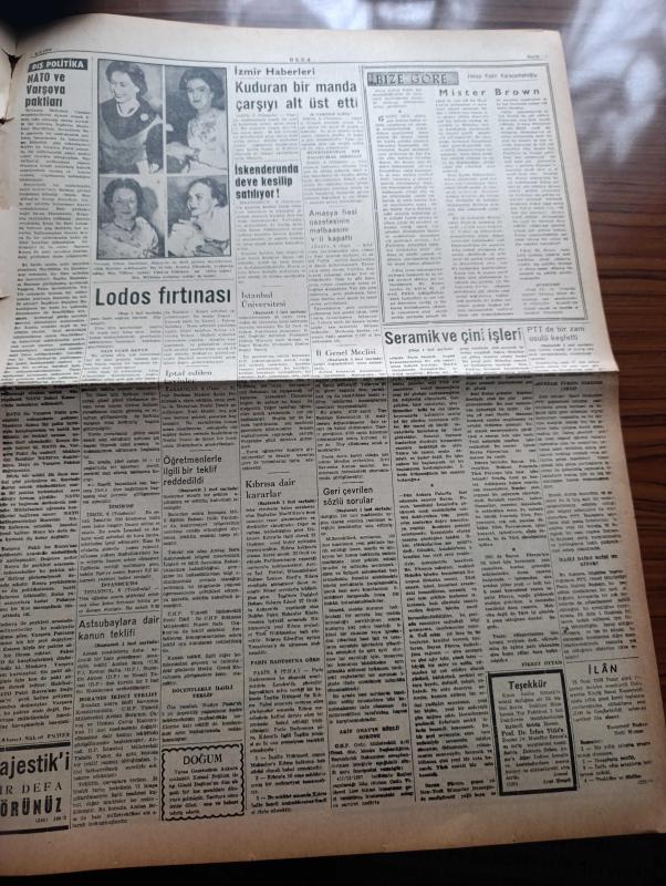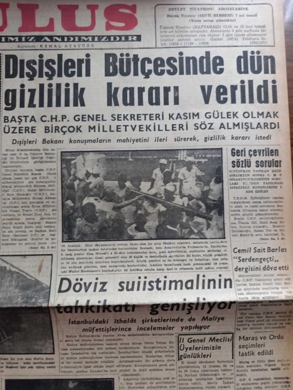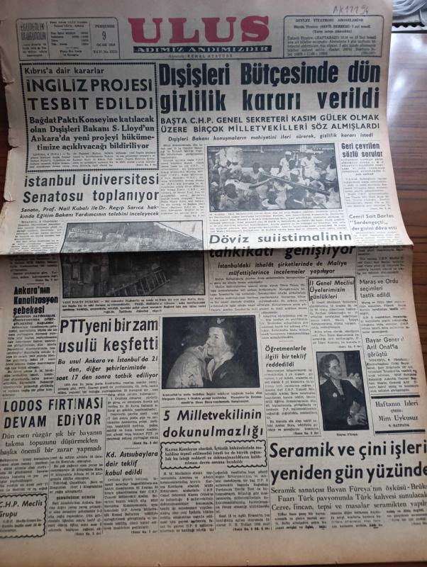 Ulus Gazetesi - Turkish Newspaper - 9 Ocak 1958 - Kıbrıs'a dair kararlar İngiliz projesi tespit edildi - Dışişleri bütçesinde Dün gizlilik kararı verildi - başta CHP Genel sekreteri Kasım Gülek olmak üzere birçok milletvekilleri söz almışlardır - döviz suistimalinin tahkikatı genişliyor - Maraş ve Ordu seçimleri tasdik edildi - İstanbul Üniversitesi senatosu toplanıyor - PTT yeni bir zam usulü keşfetti - Celal Bayar General Arif Onat ile görüştü - seramik sanatçısı bayan Füreyya'nın öyküsü fotoğraf - Vatan Yolunda Milli mücadele hatıraları yazan Yakup Kadri Karaosmanoğlu Yazı Dizisi - NATO ve Varşova paktları yazan Ahmet Şükrü Esmer - amasya'nın sesi gazetesinin matbaasını Vali kapattı - Mister Brown Yazan Yakup Kadri Karaosmanoğlu - postacının kızı filmi büyük sinemada - senin için filmi başrolde Nedret Güvenç Nursan Alçam park ve sus sinemasında - Ankara'da 24 saat sinema tiyatro programı - Ordu takımımızı çalıştırması için Dick'in Kulübü Galatasaray'a dün müracaat edildi adlı eser, Kitap > Süreli Yayınlar > Gazeteler > Türkiye > Genel > Günlük kategorisinde İkinci El olarak satıştadır.