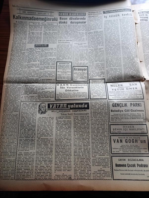 Ulus Gazetesi - Turkish Newspaper - 9 Ocak 1958 - Kıbrıs'a dair kararlar İngiliz projesi tespit edildi - Dışişleri bütçesinde Dün gizlilik kararı verildi - başta CHP Genel sekreteri Kasım Gülek olmak üzere birçok milletvekilleri söz almışlardır - döviz suistimalinin tahkikatı genişliyor - Maraş ve Ordu seçimleri tasdik edildi - İstanbul Üniversitesi senatosu toplanıyor - PTT yeni bir zam usulü keşfetti - Celal Bayar General Arif Onat ile görüştü - seramik sanatçısı bayan Füreyya'nın öyküsü fotoğraf - Vatan Yolunda Milli mücadele hatıraları yazan Yakup Kadri Karaosmanoğlu Yazı Dizisi - NATO ve Varşova paktları yazan Ahmet Şükrü Esmer - amasya'nın sesi gazetesinin matbaasını Vali kapattı - Mister Brown Yazan Yakup Kadri Karaosmanoğlu - postacının kızı filmi büyük sinemada - senin için filmi başrolde Nedret Güvenç Nursan Alçam park ve sus sinemasında - Ankara'da 24 saat sinema tiyatro programı - Ordu takımımızı çalıştırması için Dick'in Kulübü Galatasaray'a dün müracaat edildi, Kasım Gülek tarafından kaleme alınmıştır. Ulus Gazetesi - Turkish Newspaper - 9 Ocak 1958 - Kıbrıs'a dair kararlar İngiliz projesi tespit edildi - Dışişleri bütçesinde Dün gizlilik kararı verildi - başta CHP Genel sekreteri Kasım Gülek olmak üzere birçok milletvekilleri söz almışlardır - döviz suistimalinin tahkikatı genişliyor - Maraş ve Ordu seçimleri tasdik edildi - İstanbul Üniversitesi senatosu toplanıyor - PTT yeni bir zam usulü keşfetti - Celal Bayar General Arif Onat ile görüştü - seramik sanatçısı bayan Füreyya'nın öyküsü fotoğraf - Vatan Yolunda Milli mücadele hatıraları yazan Yakup Kadri Karaosmanoğlu Yazı Dizisi - NATO ve Varşova paktları yazan Ahmet Şükrü Esmer - amasya'nın sesi gazetesinin matbaasını Vali kapattı - Mister Brown Yazan Yakup Kadri Karaosmanoğlu - postacının kızı filmi büyük sinemada - senin için filmi başrolde Nedret Güvenç Nursan Alçam park ve sus sinemasında - Ankara'da 24 saat sinema tiyatro programı - Ordu takımımızı çalıştırması için Dick'in Kulübü Galatasaray'a dün müracaat edildi adlı eser Türkçe dilindedir.