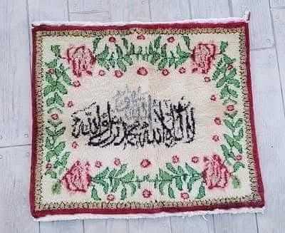 Üzerinde Kelime-i Tevhid yazılı eski Isparta işi el dokuma duvar halısı. Ölçüleri 82cm x 70cm dir.