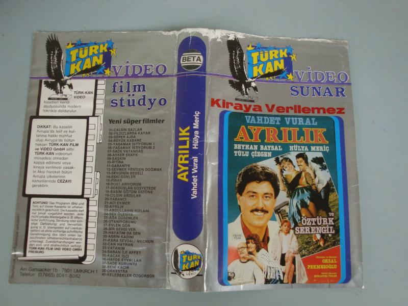 VAHDET VURAL - ÖZTÜRK SERENGİL " Ayrılık " VIDEO KASET KARTONET TÜRK KAN VİDEO ALMANYA BASKI " Sadece KARTONET ..." " Resimde de görüleceği üzere Kartonet üst kısmı hafif hasarlıdır "