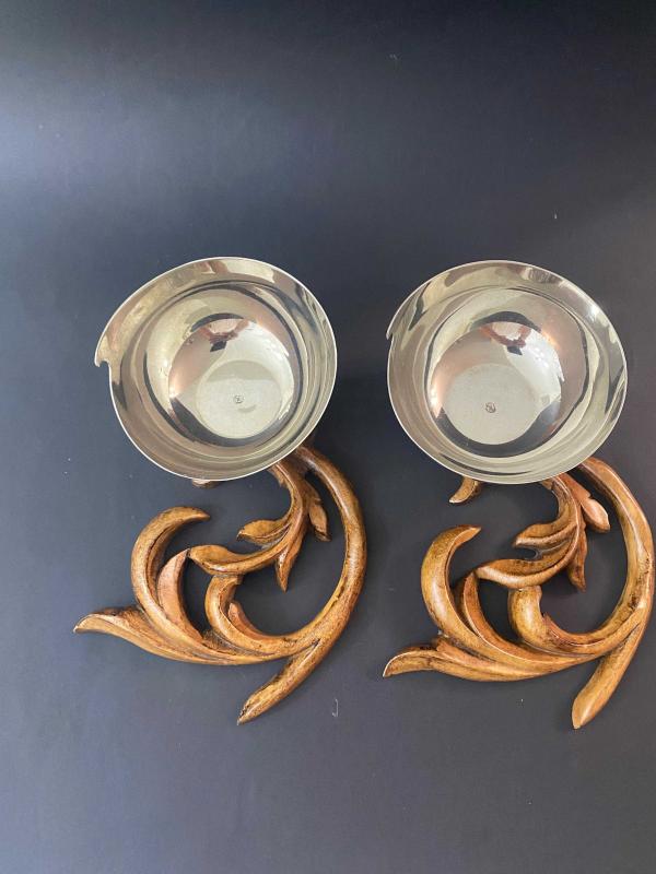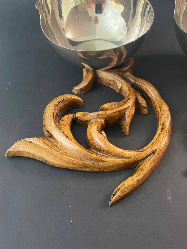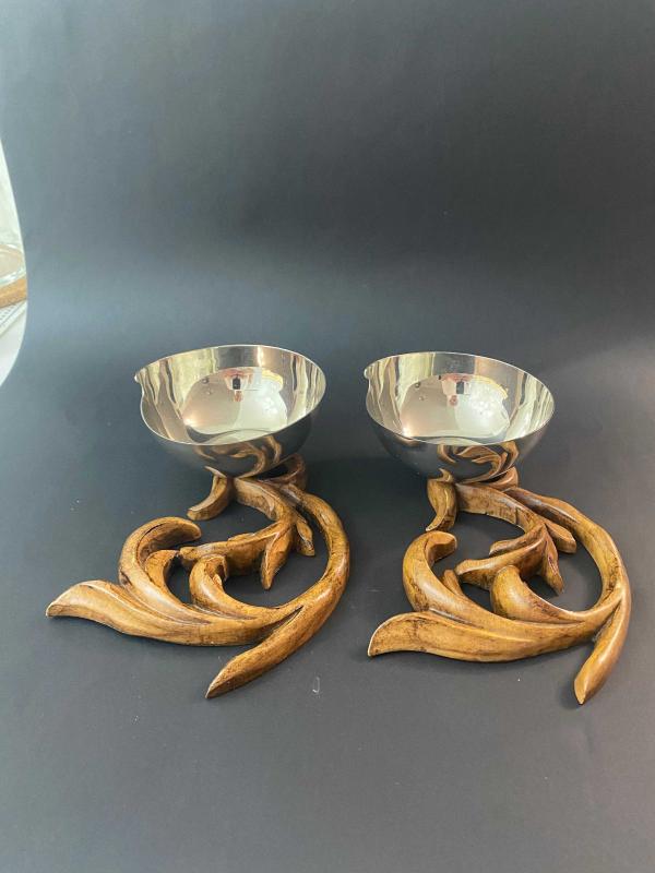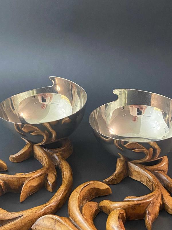 Masanızda VAKKO şıklığı güzelliği. Haznelerin iç tabanında Vakko logosu yer alan iki adet kendi gönlünüze göre değerlendireceğiniz gümüş kaplama kase. Vakko'nun ev dekorasyonu ve "Vakko Home" koleksiyonları, zamansız tasarımları ve yüksek işçilik kalitesiyle koleksiyonerler tarafından çok sevilir. . Bu obje çifti sadece birer çerezlik değil, masada birer sanat eseri gibi duran Art Nouveau esintili parçalar. . Vakko’nun o eşsiz tasarım çizgisini yansıtan, nadir formda ikili sunumluk/çerezlik seti. Kaselerin ağız kısımlarının kesimi Vakko logosuna atıfla şekillenmiş. . Organik formlu, el işçiliği ağaç oyma kaideler üzerinde yükselen gümüş kaplama hazneler. . . #Antikacekmece #Vakko #VakkoHome #gümüşkase #evdekorasyonu
