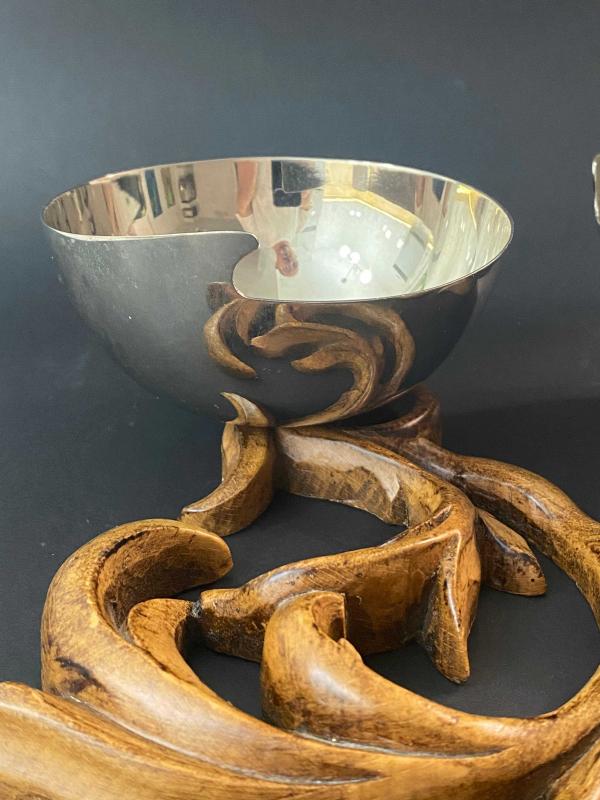 VAKKO kase çift ahşap oymalı taban VAKKO gümüş kaplama kase başlıklı antika/koleksiyon objesi Türkiye menşe’lidir. 2000 ve sonrası dönemine aittir.