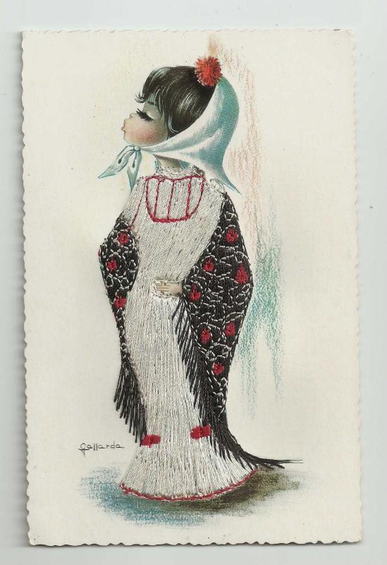 ** VALENCIA / TAMAMEN İPLİKLER DOKUNARAK YAPILMIŞ İSPANYOL KIZI KARTPOSTALI ** 14 x 9 cm.ebadında,arkası yazısız ve süper kondüsyonda,tamamen renkli ipliklerden dokunarak yapılmış, İspanya Valencia imalatı,küçük bir İspanyol kızının nadir kartpostalıdır...