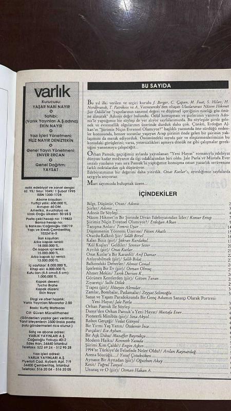 VARLIK EDİBİYAT VE SANAT DERGİSİ - SAYI: 1049 - ŞUBAT 1995- YAŞAR NABI NAYIR - EKİN NAYIR - FİLİZ NAYIR DENİZTEKİN - ENVER ERCAN - ADONİS - ORHAN PAMUK - JALE PARLA - MUSTAFA EVER - ONAT KUTLAR - KONUR ERTOP - ERDOĞAN ALKAN - TOMRIS UYAR - FÜSUN AKATLI - SALAH BİRSEL - ŞÜKRAN KURDAKUL - SENNUR SEZER - ARİF DAMAR - SALİH BOLAT - AHMET CEMAL - OSMAN OLMUŞ - TARIK DURSUN K - GÜVEN TURAN - SULHİ DÖLEK - HÜSEYİN ALEMDAR - ZEYYAT SELİMOĞLU - SİNA AKYOL - VEDAT GÜNYOL - ÖZDEMİR İNCE - ECE AYHAN - MUZAFFER BUYRUKÇU - KENNETH YASUDA - ENGİN AŞKIN - ARSLAN KAYNARDAĞ - YUSUF ÇOTUKSÖKEN - OĞUZHAN AKAY - TUĞRUL TANYOL - OSMAN HAKAN A - ZİYA GÖKALP - ZİYA PAŞA - ŞİİRİMİZ NİÇİN EVRENSEL OLAMIYOR - ORHAN PAMUK'UN BİR GENÇ ADAM OLARAK PORTRESİ YENİ HAYAT - ULUSLARARASI NÂZIM HİKMET ŞİİR ÖDÜLÜ - ONAT KUTLAR ANMASI - BİLGE DÜŞÜNÜR OZAN HİKAYESİ, YAZAN : ADONİS ŞİİRLER HİKAYESİ, YAZAN : ADONİS ADONİS İLE SÖYLEŞİ HİKAYESİ, YAZAN : ADONİS NÂZIM HİKMET’İN BİR ŞİİRİNDE DİVAN EDEBİYATINDAN İZLER HİKAY-64 SAYFA adlı eser, Kitap > Süreli Yayınlar > Dergiler > Magazin, Moda kategorisinde İkinci El olarak satıştadır.