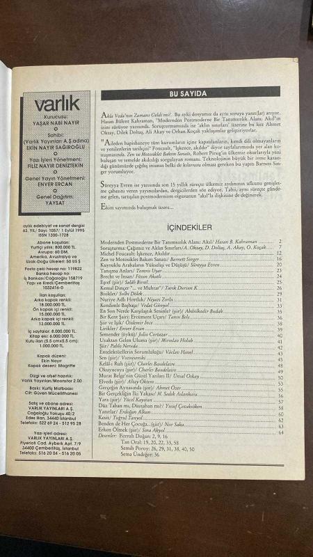 VARLIK EDİBİYAT VE SANAT DERGİSİ - SAYI: 1056 - EYLÜL 1995 -ZEYYAT SELİMOĞLU – OKTAY AKBAL – SULHİ DÖLEK – TARIK DURSUN K. – ENVER ERCAN – HASAN B. KAHRAMAN – ATIF YILMAZ – JEAN-MARIE DOMENACH – TAHSiN YÜCEL – JEAN SASSON – HATİCE BİLİMER - HALDUN TANER ÖYKÜ ÖDÜLÜ – DERİN DONDURUCU – DEPREM – GÜZEL DÜŞLERİN SONU – TESLİM OL KÜÇÜK – MİZAH VE PSİKOLOJİ – MODERNİZM VE POSTMODERNİZM – AKIL VE DEMOKRASİ – BİLİMSEL DÜŞÜNCE – FELSEFE VE TEKNOLOJİ – POLİTİKA VE PROPAGANDA – SULTANA’NIN KIZLARI – SUUDİ ARABİSTAN’DA KADIN HAKLARI - ZEYYAT SELİMOĞLU: DERİN DONDURUCU VE DEPREM - SIGMUND FREUD – NIETZSCHE – LACAN – WITTGENSTEIN – LYOTARD – DELEUZE – GUATTARI – PLATON – ARISTOTELES – FEYERABEND – POPPER – TEHMINA DURRANI – MUSTAFA KHAR – BENAZIR BHUTTO – BETTY MAHMUDİ – JEAN SASSON – MELİKE MUKADDEM - AKIL VE MODERNİZM – FREUD METAFİZİĞİ – BATI AKLI VE İKTİDAR – DİLİN İKTİDAR ARACI OLARAK KULLANIMI – KİMLİK VE YETİMLEŞME – POSTMODERN DÖNEMİN AKIL ELEŞTİRİSİ – FEYERABEND VE OLGUCU ELEŞTİRİ -64 SAYFA adlı eser, Kitap > Süreli Yayınlar > Dergiler > Magazin, Moda kategorisinde İkinci El olarak satıştadır.