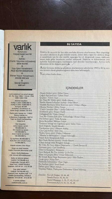 VARLIK EDİBİYAT VE SANAT DERGİSİ - SAYI: 1084 - OCAK 1998 - YAŞAR NABİ NAYIR – EKİN NAYIR – FİLİZ NAYIR DENİZTEKİN – ENVER ERCAN – HİLMİ YAVUZ – TAHSİN YÜCEL – TOMRİS UYAR – HULKİ AKTUNÇ – ERHAN BENER – ORHAN ALKAYA – ATİLLA ÖZKIRIMLI – FERGUN ÖZELLİ – VEDAT GÜNYOL – KONUR ERTOP – YELDA KARATAŞ – MEHMET YALÇIN – SELİM TEMO – küçük İSKENDER – HÜSEYİN ATABAŞ – SEZER ATEŞ – ERDEM GÖKYARAN – ZEYYAT SELİMOĞLU – NECDET BATUM – TARIK DURSUN K. – CARL SANDBURG – MALAPARTE – LI FU-YEN – UMUT ÖZKIRIMLI – FİLİZ ÖZDEM – NILAY ÖZER – ÖNER YAĞCI – SEVAL ESASLI – MESUT ADNAN – GÜNEL ALTIŞTAŞ- KİTLE İLETİŞİMİNDE ETİK – ÇAĞCIL AŞK ŞARKILARI – İSLAM VE ÇATIŞMA MİTİ – AKŞAM ŞİİRLERİ - ÇAĞCIL AŞK ŞARKILARI HİKAYESİ, YAZAN : TAHSİN YÜCEL İPUÇLARI HİKAYESİ, YAZAN : TOMRİS UYAR NAZİFE HANIM’LA KIZLARI HİKAYESİ, YAZAN : ERHAN BENER - ŞİİRLİ DEĞNEK HİKAYESİ, YAZAN : küçük İSKENDER ÇÖP ÇAĞ HİKAYESİ, YAZAN : SEZER ATEŞ “HIMLER’İN MEKTUPLARI” HİKAYESİ, YAZAN : ZEYYAT SELİMOĞLU BİRİ ÖTEKİ BİRİLERİ HİKAYE- 64 SAYFA, YAŞAR NBİ NAYIR tarafından kaleme alınmıştır. Kitap EKİN BASIM EVİ tarafından yayınlanmıştır. 64 sayfadır. VARLIK EDİBİYAT VE SANAT DERGİSİ - SAYI: 1084 - OCAK 1998 - YAŞAR NABİ NAYIR – EKİN NAYIR – FİLİZ NAYIR DENİZTEKİN – ENVER ERCAN – HİLMİ YAVUZ – TAHSİN YÜCEL – TOMRİS UYAR – HULKİ AKTUNÇ – ERHAN BENER – ORHAN ALKAYA – ATİLLA ÖZKIRIMLI – FERGUN ÖZELLİ – VEDAT GÜNYOL – KONUR ERTOP – YELDA KARATAŞ – MEHMET YALÇIN – SELİM TEMO – küçük İSKENDER – HÜSEYİN ATABAŞ – SEZER ATEŞ – ERDEM GÖKYARAN – ZEYYAT SELİMOĞLU – NECDET BATUM – TARIK DURSUN K. – CARL SANDBURG – MALAPARTE – LI FU-YEN – UMUT ÖZKIRIMLI – FİLİZ ÖZDEM – NILAY ÖZER – ÖNER YAĞCI – SEVAL ESASLI – MESUT ADNAN – GÜNEL ALTIŞTAŞ- KİTLE İLETİŞİMİNDE ETİK – ÇAĞCIL AŞK ŞARKILARI – İSLAM VE ÇATIŞMA MİTİ – AKŞAM ŞİİRLERİ - ÇAĞCIL AŞK ŞARKILARI HİKAYESİ, YAZAN : TAHSİN YÜCEL İPUÇLARI HİKAYESİ, YAZAN : TOMRİS UYAR NAZİFE HANIM’LA KIZLARI HİKAYESİ, YAZAN : ERHAN BENER - ŞİİRLİ DEĞNEK HİKAYESİ, YAZAN : küçük İSKENDER ÇÖP ÇAĞ HİKAYESİ, YAZAN : SEZER ATEŞ “HIMLER’İN MEKTUPLARI” HİKAYESİ, YAZAN : ZEYYAT SELİMOĞLU BİRİ ÖTEKİ BİRİLERİ HİKAYE- 64 SAYFA adlı eser Türkçe dilindedir.