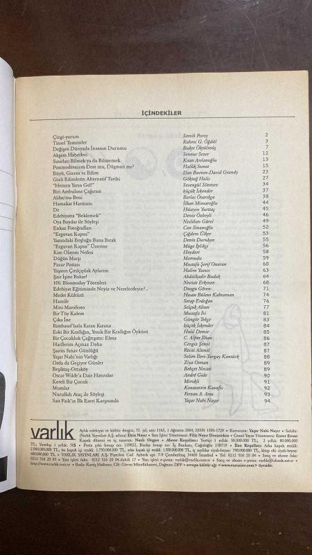 VARLIK EDİBİYAT VE SANAT DERGİSİ - SAYI: 1163 - AĞUSTOS 2004 - YAŞAR NABİ NAYIR - EKİN NAYIR - FİLİZ NAYIR DENİZTEKİN - ENVER ERCAN - TURGAY KANTÜRK - NEDRET GÜRCAN - ONUR CAYMAZ - BETÜL TARİMAN - VEDAT GÜNYOL - OYA BAYDAR - DEMİRTAŞ CEYHUN - DEMİR ÖZLÜ - AHMET YORULMAZ - METİN FINDIKÇI - ERHAN BENER - FERİDUN ANDAÇ - MUSTAFA DELİOĞLU - HENRI TROYAT - BİRSEN KARACA - ENDER GÜROL - GERTRUDE DURUSOY - AHMET NECDET - SULHİ DOLEK - ŞEMSETTİN ÜNLÜ - OSMAN CEMAL KAYGILI - CEVDET KUDRET - MEHMET ÖZGÜL - GÜNEY DAL - ABDİ İPEKÇİ - İLHAN BERK - F. NİLGÜN ARAS - HİLMİ ZİYA ÜLKEN - TURGAY FİŞEKÇİ - OKTAY AKBAL - SEMİH POROY - RAHMİ G. ÖĞDÜL - BUKET ÖKTÜLMÜŞ - HALAK SUNAT - DAN BURTON - DAVID GRANDY - GÖKTUĞ HALİS - SEVENGÜL SÖNMEZ - KÜÇÜK İSKENDER - BARLAS ÖZARIKÇA - İLHAN MİMAROĞLU - HÜSEYİN YURTTAŞ - DENİZ ÖZBEYLİ - NESLİHAN GÜREL - CAN SİNANOĞLU - ÇİĞDEM ÜLKER - DENİZ DURUKAN - MÜGE İPLİKÇİ - HAYDARİ - MAMUDU - MUSTAFA ŞERİF ONARAN - HALİM YAZICI - ABDÜLKADİR BUDAK - NEVZAT ERKMEN - - 80 SAYFA, YAŞAR NBİ NAYIR tarafından kaleme alınmıştır. Kitap EKİN BASIM EVİ tarafından yayınlanmıştır. 80 sayfadır. VARLIK EDİBİYAT VE SANAT DERGİSİ - SAYI: 1163 - AĞUSTOS 2004 - YAŞAR NABİ NAYIR - EKİN NAYIR - FİLİZ NAYIR DENİZTEKİN - ENVER ERCAN - TURGAY KANTÜRK - NEDRET GÜRCAN - ONUR CAYMAZ - BETÜL TARİMAN - VEDAT GÜNYOL - OYA BAYDAR - DEMİRTAŞ CEYHUN - DEMİR ÖZLÜ - AHMET YORULMAZ - METİN FINDIKÇI - ERHAN BENER - FERİDUN ANDAÇ - MUSTAFA DELİOĞLU - HENRI TROYAT - BİRSEN KARACA - ENDER GÜROL - GERTRUDE DURUSOY - AHMET NECDET - SULHİ DOLEK - ŞEMSETTİN ÜNLÜ - OSMAN CEMAL KAYGILI - CEVDET KUDRET - MEHMET ÖZGÜL - GÜNEY DAL - ABDİ İPEKÇİ - İLHAN BERK - F. NİLGÜN ARAS - HİLMİ ZİYA ÜLKEN - TURGAY FİŞEKÇİ - OKTAY AKBAL - SEMİH POROY - RAHMİ G. ÖĞDÜL - BUKET ÖKTÜLMÜŞ - HALAK SUNAT - DAN BURTON - DAVID GRANDY - GÖKTUĞ HALİS - SEVENGÜL SÖNMEZ - KÜÇÜK İSKENDER - BARLAS ÖZARIKÇA - İLHAN MİMAROĞLU - HÜSEYİN YURTTAŞ - DENİZ ÖZBEYLİ - NESLİHAN GÜREL - CAN SİNANOĞLU - ÇİĞDEM ÜLKER - DENİZ DURUKAN - MÜGE İPLİKÇİ - HAYDARİ - MAMUDU - MUSTAFA ŞERİF ONARAN - HALİM YAZICI - ABDÜLKADİR BUDAK - NEVZAT ERKMEN - - 80 SAYFA adlı eser Türkçe dilindedir.