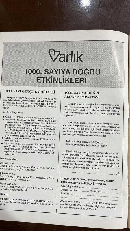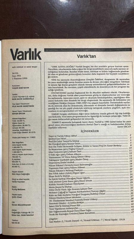VARLIK EDİBİYAT VE SANAT DERGİSİ - SAYI: 993 - HAZİRAN 1990 -YAŞAR NABİ NAYIR – EKİN NAYIR SAĞIROĞLU – FİLİZ NAYIR DENİZTEKİN – ENVER ERCAN – KEMAL ÖZER – OKTAY AKBAL – CAN YÜCEL – CAHİT TANYOL – ATAOL BEHRAMOĞLU – NAZIM HİKMET – FADEYEV – ERGUN UĞUR – İLHAN BERK – SENNUR SEZER – TANER BERKSOY – TUĞRUL TANYOL – ADNAN ÖZER – ORHAN ALKAYA – AHMET OKTAY – MABİR ÖZTAŞ – ERDAL ATABEK – METİN KAÇAN – TUNCAY AKGÜN – KUBİLAY UNSAL – HENRI MICHAUX – ERDAL GÖKSOY – ARİLLA BİRKİYE – PINAR KİLİR – ÖNER YAĞA – NURER UĞURLU – ADNAN ÖZYALÇINER – SAMİ KARAÖREN – SAİT MADEN – NEZİH DANYAL – KEMAL GÖKHAN – MERAL SİPAHİ - 1000. SAYIYA DOĞRU – GENÇLİK ÖDÜLLERİ – MEYDAN SAYFASI – TÜRKİYE DOSYASI 1980–1990 – ŞİİR YAĞMURUNDA KEMAL ÖZER - 1000. SAYIYA DOĞRU – GENÇLİK ÖDÜLLERİ – MEYDAN SAYFASI – TÜRKİYE DOSYASI 1980–1990 – ŞİİR YAĞMURUNDA KEMAL ÖZER - ON ON YILDA EKONOMİK GELİŞME, KÜLTÜR VE SANAT HİKAYESİ, YAZAN : TANER BERKSOY YAZINIMIZIN 10 YILINA BAKIŞ HİKAYESİ, YAZAN : AHMET OKTAY - 50 SAYFA, YAŞAR NBİ NAYIR tarafından kaleme alınmıştır. Kitap EKİN BASIM EVİ tarafından yayınlanmıştır. 50 sayfadır. VARLIK EDİBİYAT VE SANAT DERGİSİ - SAYI: 993 - HAZİRAN 1990 -YAŞAR NABİ NAYIR – EKİN NAYIR SAĞIROĞLU – FİLİZ NAYIR DENİZTEKİN – ENVER ERCAN – KEMAL ÖZER – OKTAY AKBAL – CAN YÜCEL – CAHİT TANYOL – ATAOL BEHRAMOĞLU – NAZIM HİKMET – FADEYEV – ERGUN UĞUR – İLHAN BERK – SENNUR SEZER – TANER BERKSOY – TUĞRUL TANYOL – ADNAN ÖZER – ORHAN ALKAYA – AHMET OKTAY – MABİR ÖZTAŞ – ERDAL ATABEK – METİN KAÇAN – TUNCAY AKGÜN – KUBİLAY UNSAL – HENRI MICHAUX – ERDAL GÖKSOY – ARİLLA BİRKİYE – PINAR KİLİR – ÖNER YAĞA – NURER UĞURLU – ADNAN ÖZYALÇINER – SAMİ KARAÖREN – SAİT MADEN – NEZİH DANYAL – KEMAL GÖKHAN – MERAL SİPAHİ - 1000. SAYIYA DOĞRU – GENÇLİK ÖDÜLLERİ – MEYDAN SAYFASI – TÜRKİYE DOSYASI 1980–1990 – ŞİİR YAĞMURUNDA KEMAL ÖZER - 1000. SAYIYA DOĞRU – GENÇLİK ÖDÜLLERİ – MEYDAN SAYFASI – TÜRKİYE DOSYASI 1980–1990 – ŞİİR YAĞMURUNDA KEMAL ÖZER - ON ON YILDA EKONOMİK GELİŞME, KÜLTÜR VE SANAT HİKAYESİ, YAZAN : TANER BERKSOY YAZINIMIZIN 10 YILINA BAKIŞ HİKAYESİ, YAZAN : AHMET OKTAY - 50 SAYFA adlı eser Türkçe dilindedir.