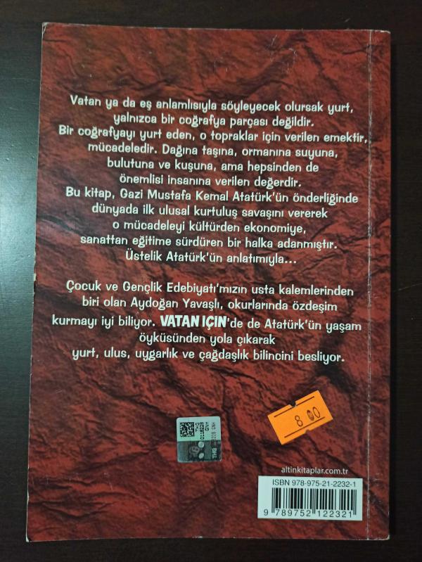 VATAN İÇİN, Aydoğan Yavaşlı tarafından kaleme alınmıştır. Kitap 2017 yılında Altın Kitaplar tarafından [İstanbul] 9789752122321 ISBN kodu ile yayınlanmıştır. Satışta olan kitap, yayınevinin 2. baskısıdır. 112 sayfadır. VATAN İÇİN adlı eser Türkçe dilindedir.