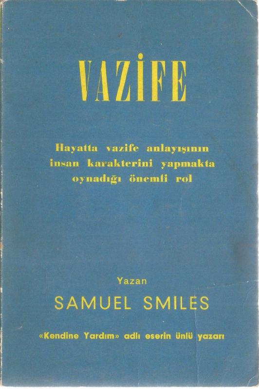 VAZİFE (HAYATTA VAZİFE ANLAYIŞININ İNSAN KARAKTERİNİ YAPMAKTA OYNADIĞI ÖNEMLİ ROL), SAMUEL SMILES tarafından kaleme alınmıştır. Kitap 1969 yılında DOĞAN KARDEŞ MATBAACILIK tarafından yayınlanmıştır. Bu baskının çevirisi MUSTAFA ERTEM tarafından yapılmıştır. 229 sayfadır. VAZİFE (HAYATTA VAZİFE ANLAYIŞININ İNSAN KARAKTERİNİ YAPMAKTA OYNADIĞI ÖNEMLİ ROL) adlı eser Türkçe dilindedir.