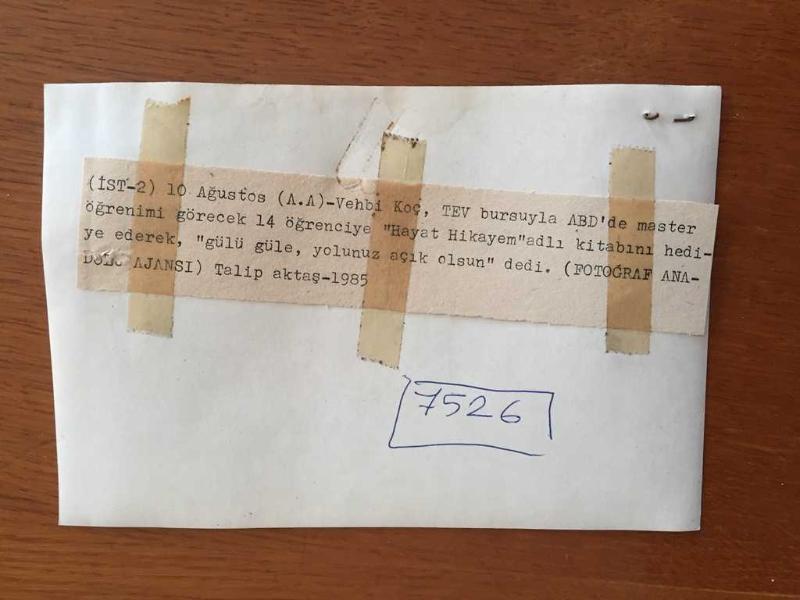 VEHBİ KOÇ'UN ORİJİNAL FOTOĞRAFI - 18 x 12 cm EBADINDA - VEHBİ KOÇ, TEV BURSUYLA ABD'DE MASTER ÖĞRENİMİ GÖRECEK 14 ÖĞRENCİYE ''HAYAT HİKAYEM'' ADLI KİTABINI HEDİYE VERİRKEN ÇEKİİLMİŞ BİR KARE, 1985, bir ay önce satışa sunulmuştur.