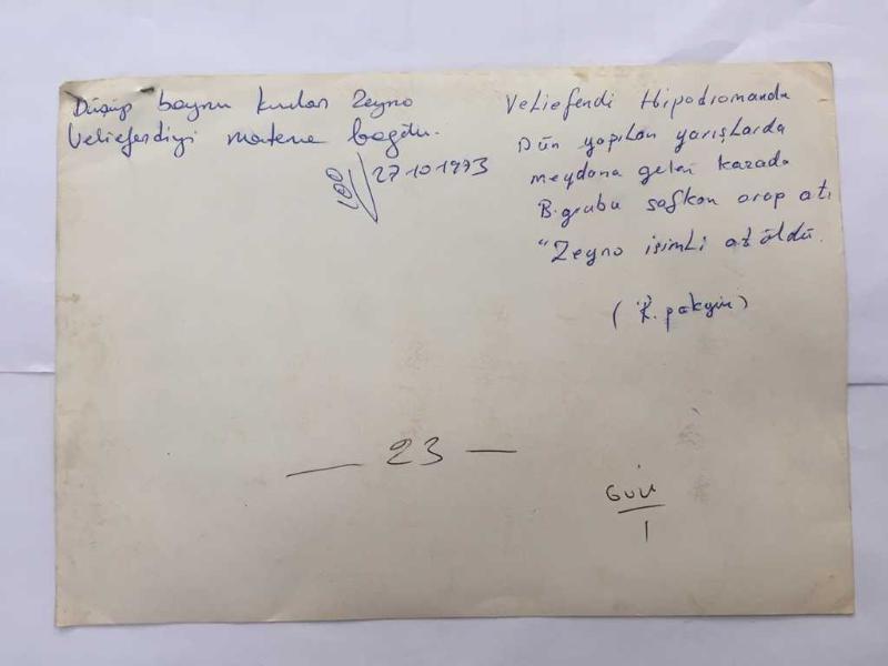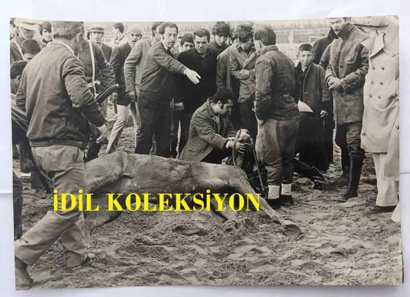 VELİEFENDİ HİPODROMU'NDA 24 EKİM 1973 TARİHLİ B GRUBU ARAP ATLARI 2000 METRE KUM HANDİKAP KOŞUSUNDA GERÇEKLEŞEN KAZADA ÜNLÜ JOKEY KAZIM YILDIZ'IN BİNDİĞİ ZEYNO İSİMLİ KISRAK BOYNUNUN KIRILMASI SONUCU ÖLDÜ. YERDE YATAN ZEYNO'YA MÜDAHALE EDİLDİĞİ ANLARDA ÇEKİLMİŞ BÜYÜK BOY ORİJİNAL FOTOĞRAF - 24 x 18 cm EBADINDA, en son 9 ay önce güncellenmiştir.