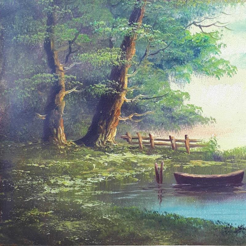 VINTAGE AHŞAP ÇERÇEVELİ ORMAN İÇİNDE GÖL KENARINDA TEKNE PEYZAJ İMZALI YAĞLIBOYA RESİM başlıklı antika/koleksiyon objesinin menşei belirtilmemiştir. Objenin ait olduğu dönem bilinmeketedir.