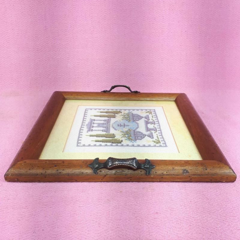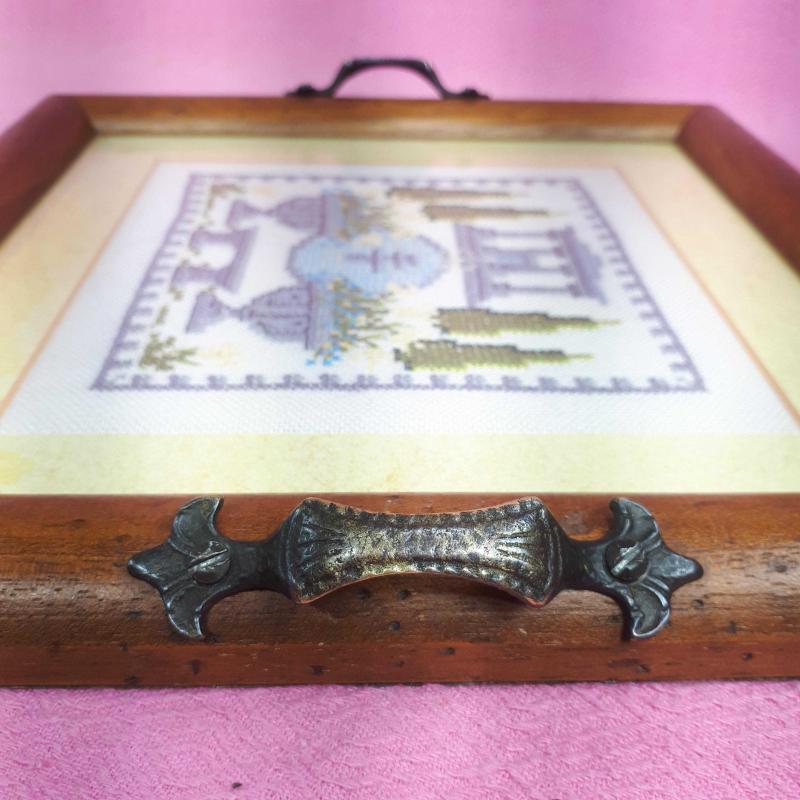 VINTAGE AVRUPA EL İŞİ KANAVİÇE , AHŞAP ÇERÇEVELİ , ÇİFT BRONZ KULPLU TABLO FORMLU TEPSİ başlıklı antika/koleksiyon objesi Avrupa menşe’lidir. 1960-1979 arası dönemine aittir.