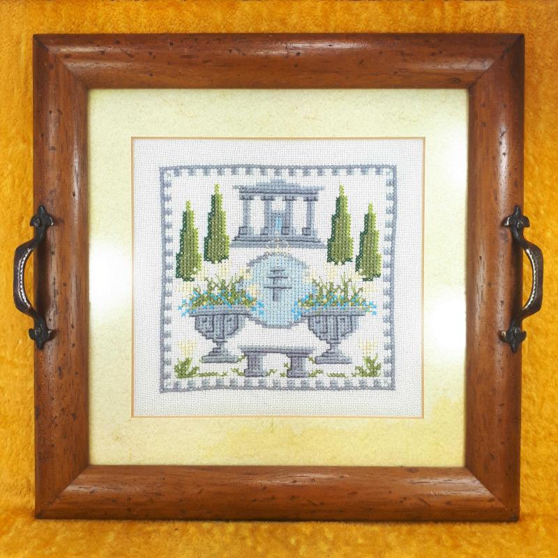 1970 LERDEN . 30 x 30 cm . ANTİK ROMA TARZI MOZOLE TASVİRLİ ; ALTAR , BÜYÜK ÇİFT KAŞPO , SERVİ AĞAÇLARI VE EN ÜSTTE MOZOLE . MASİF ESKİTME AHŞAP ÇERÇEVELİ , NONREFLEKTE CAMLI . KUSURSUZ .