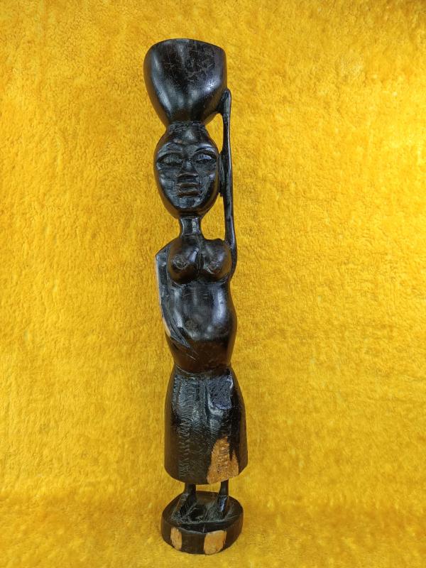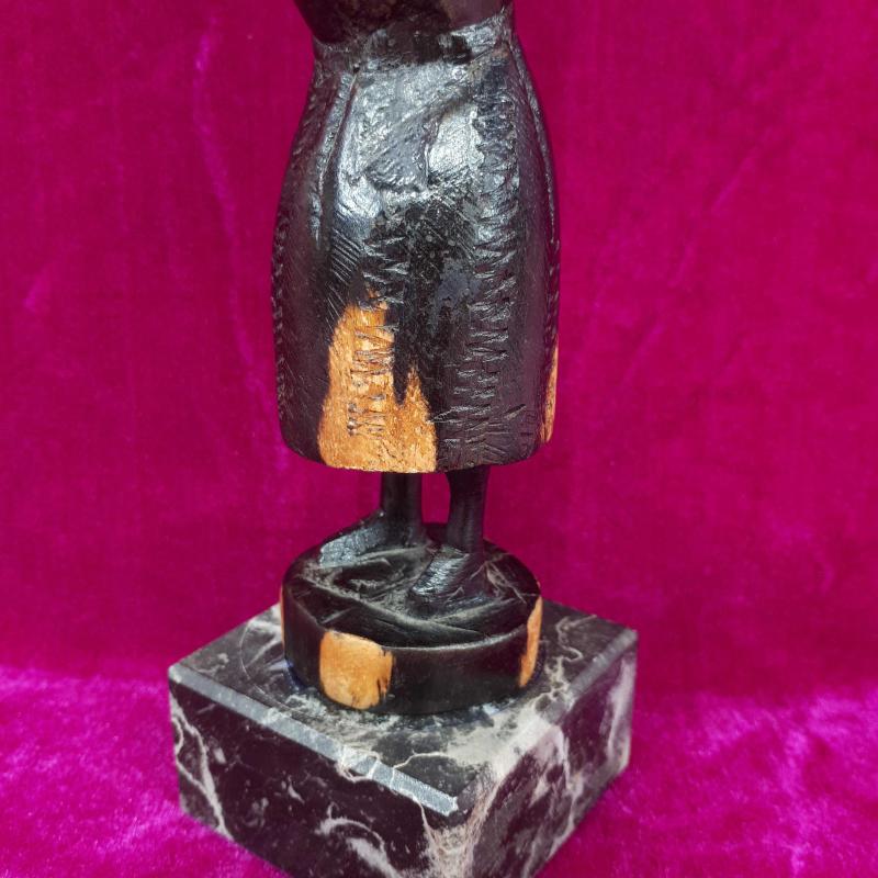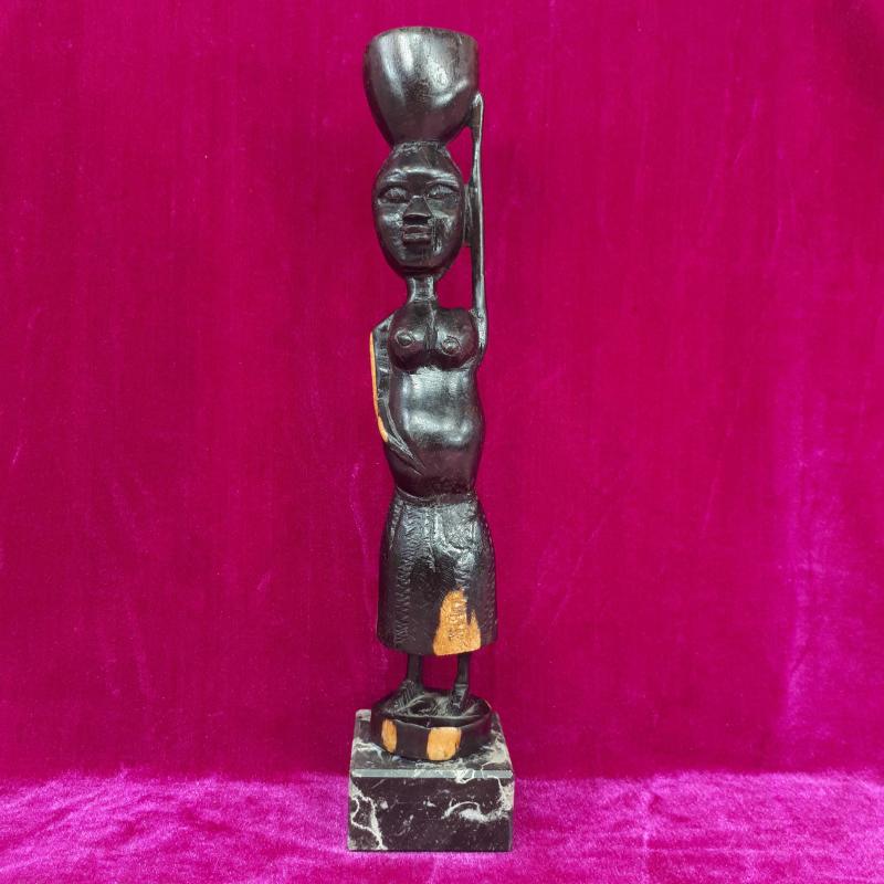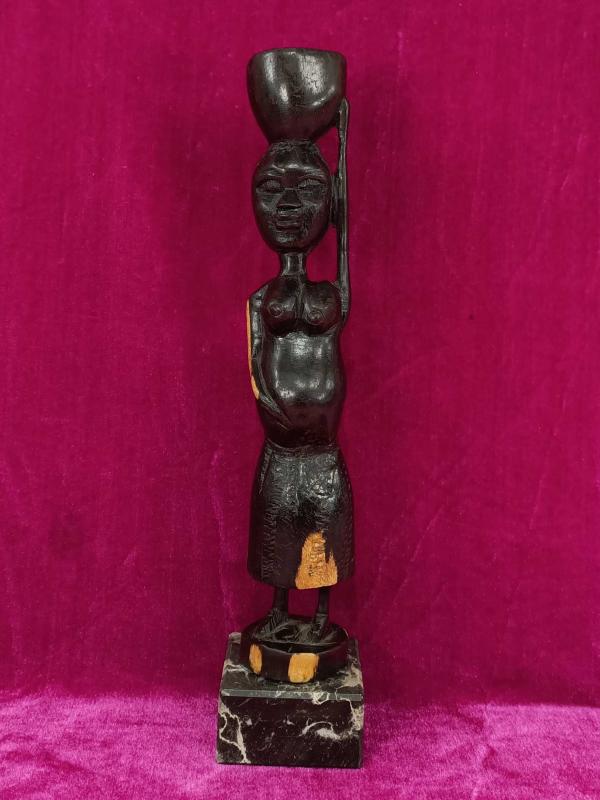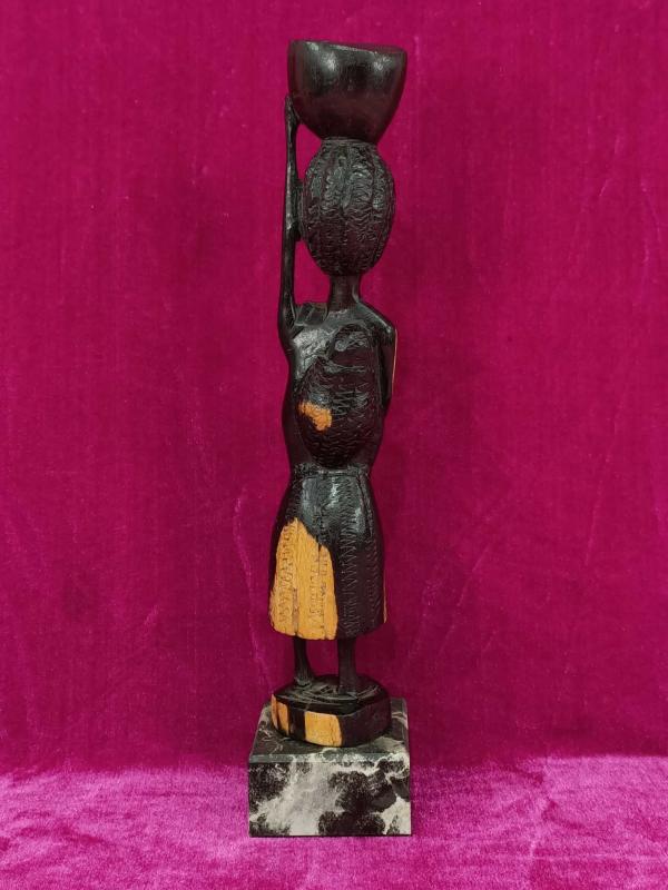 1980 LERDEN . YÜKSEKLİK SİYAH RENKLİ MERMER KAİDEYLE 31 cm , KAİDESİZ 27 cm . BAŞININ ÜSTÜNDE ERZAK SEPETİ , SIRTINDA BEBEĞİ , AFRİKALI HAMİLE GENÇ YERLİ KADIN EL OYMA ABANOZ FİGÜR BİBLO . KUSURSUZ .