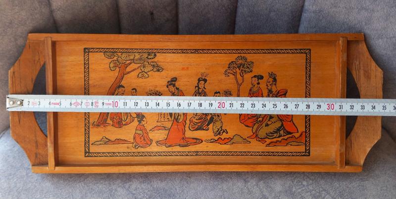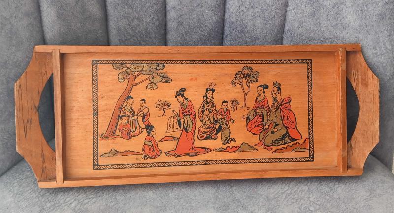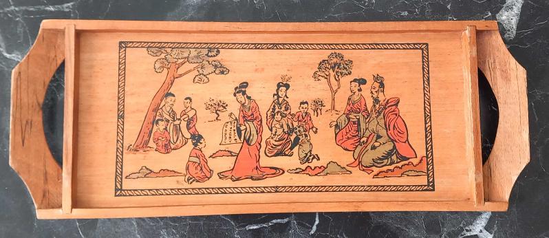 VİNTAGE EL YAPIMI EL ÇİZİMİ ÇİN KÜLTÜR TEMALI AHŞAP TEPSİ. KONDİSYON İYİ KOLEKSİYONLUK NADİR