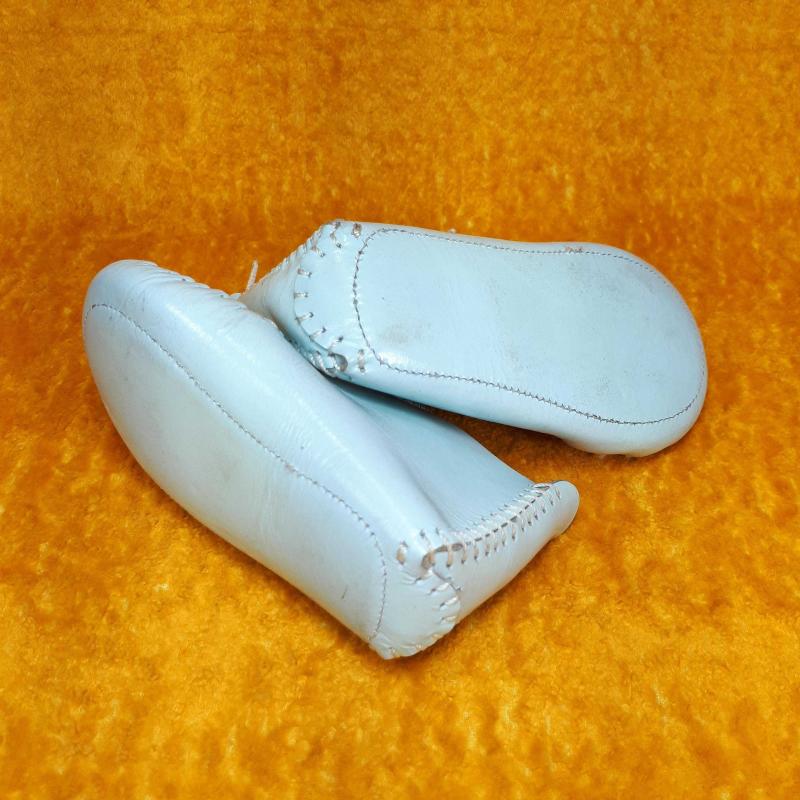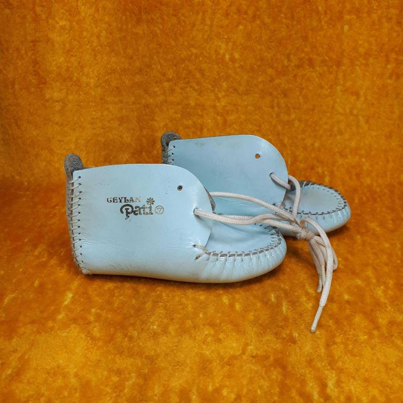 VINTAGE EL YAPIMI MAVİ RENKLİ DERİ BİR ÇİFT BEBEK PATİK başlıklı antika/koleksiyon objesi Türkiye menşe’lidir. 2000 ve sonrası dönemine aittir.