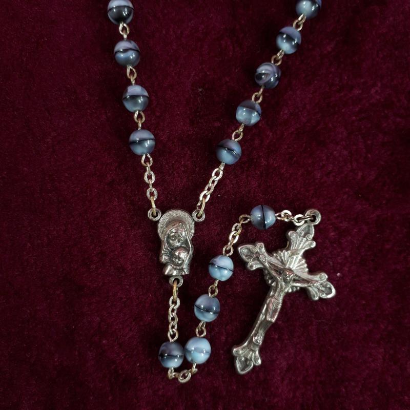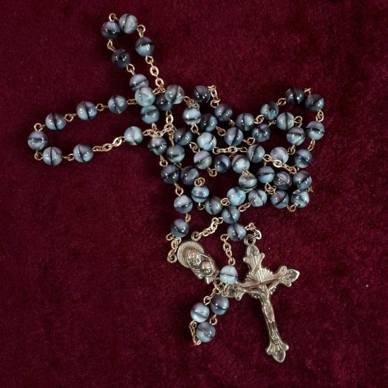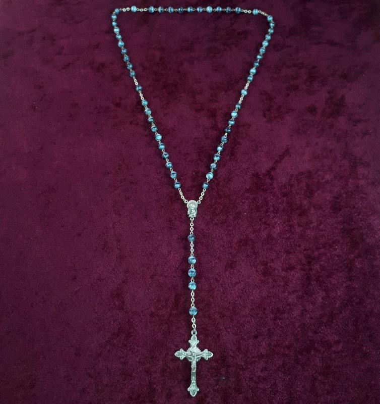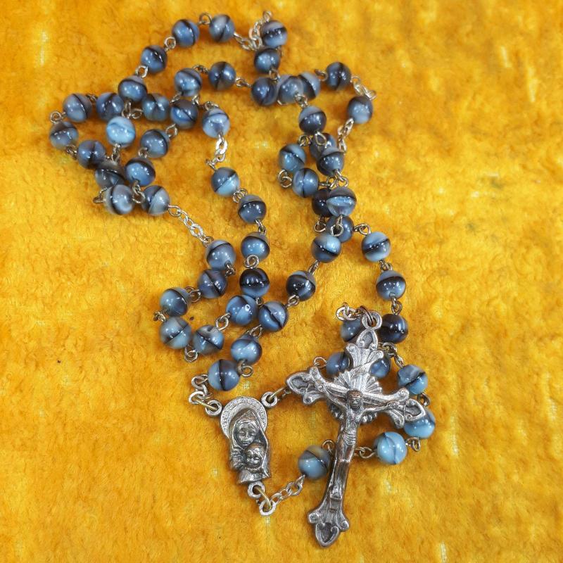 1970 LERDEN . TOPLAM BOY 46,5 cm , ALACA MAVİ RENKLİ OPALİN BONCUKLU , GÜMÜŞ KAPLAMA METAL HAÇ VE MADALYONLU . KUSURSUZ .