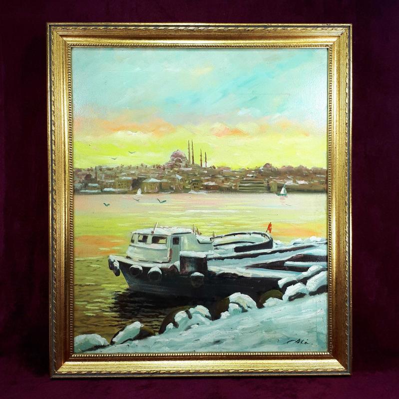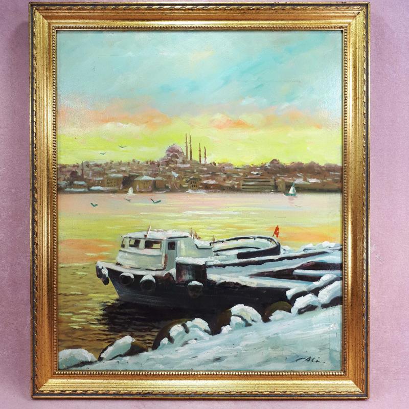 VINTAGE KARLAR ALTINDA İSTANBUL HALİÇ MANZARALI ALTIN VARAK AHŞAP ÇERÇEVELİ BÜYÜK EBAT İMZALI YAĞLIBOYA RESİM başlıklı antika/koleksiyon objesi Türkiye menşe’lidir. 1960-1979 arası dönemine aittir.