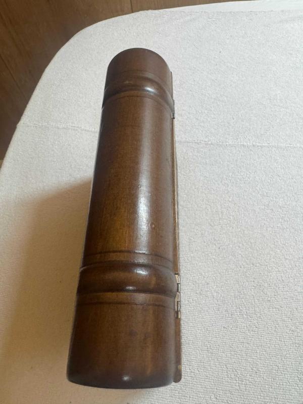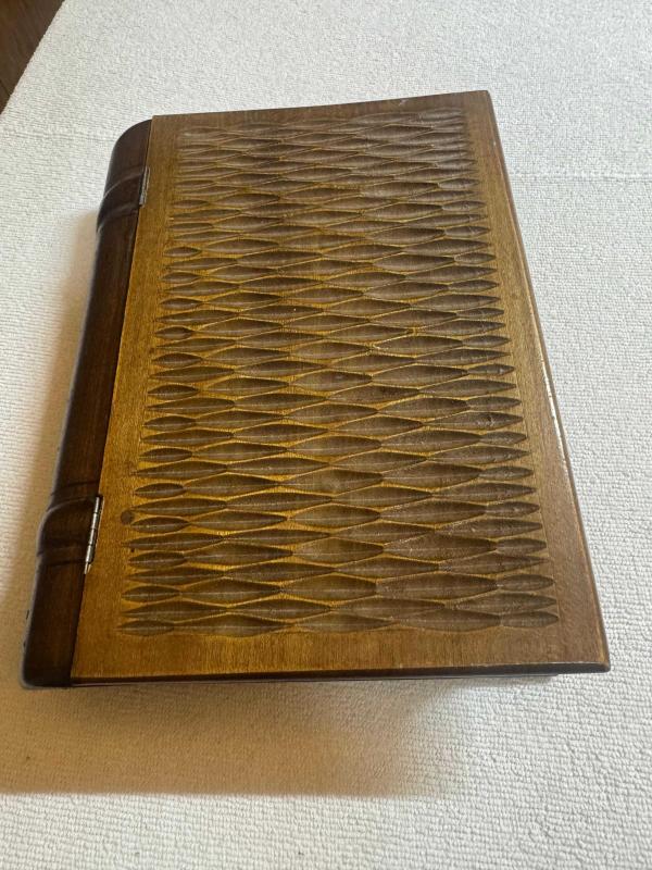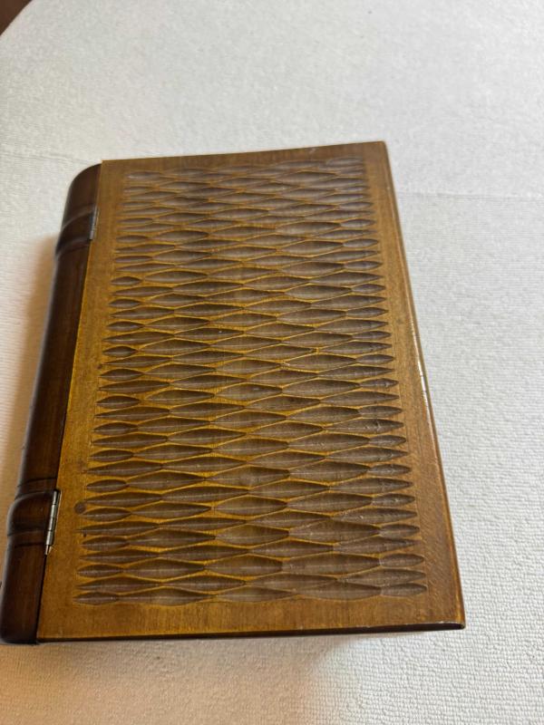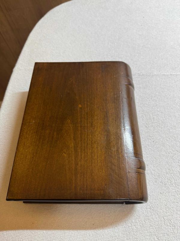 VİNTAGE Masüf El yapımı işlemeli kitap şeklinde tasarlanmış, genellikle takı,Aksesuaranahtar veya diğer küçük eşyaları saklamak için kullanılan dekoratif bir ahşap kutu başlıklı antika/koleksiyon objesi Avrupa menşe’lidir. Objenin ait olduğu dönem bilinmeketedir.