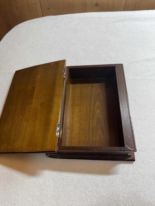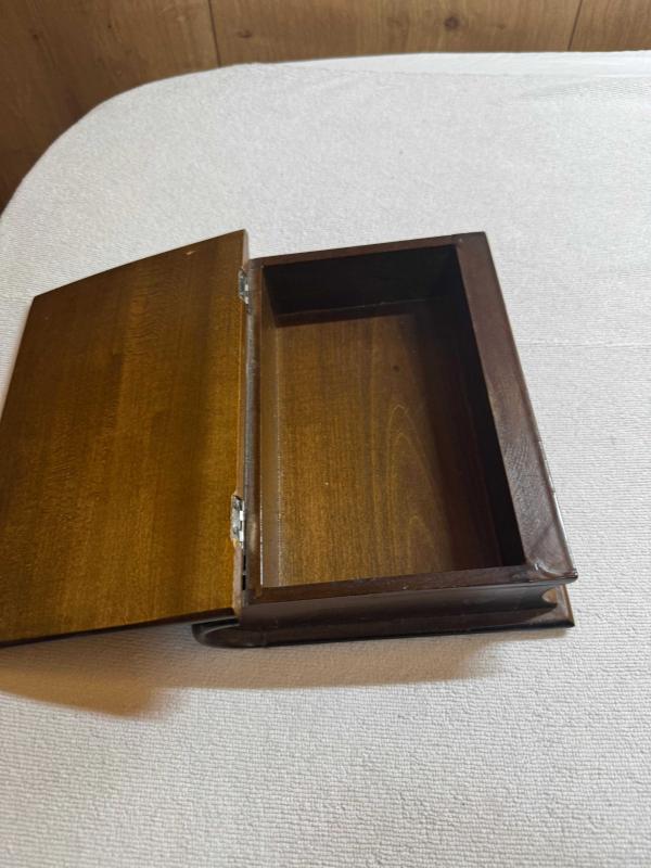 VİNTAGE Masüf El yapımı işlemeli kitap şeklinde tasarlanmış, genellikle takı,Aksesuaranahtar veya diğer küçük eşyaları saklamak için kullanılan dekoratif bir ahşap kutu
