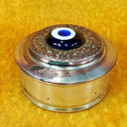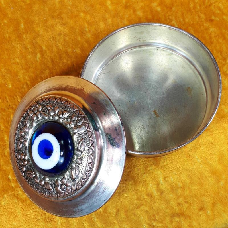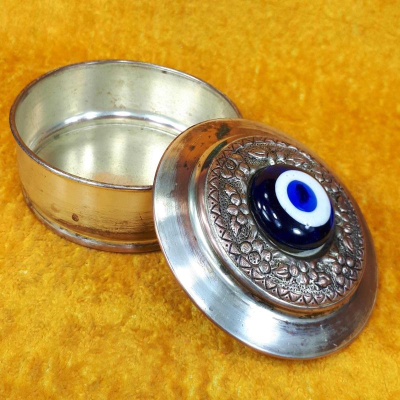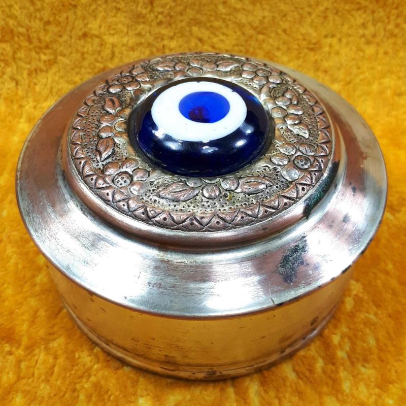 VINTAGE NAZAR BONCUKLU GÜMÜŞ KAPLAMA KAPAKLI YUVARLAK BAKIR KUTU ÇANAK başlıklı ürün, Antika-Koleksiyon, Hobi-Sanat > Antika > Antika Metal Objeler > Bakır kategorisinde İkinci El olarak satışa sunulmuştur.