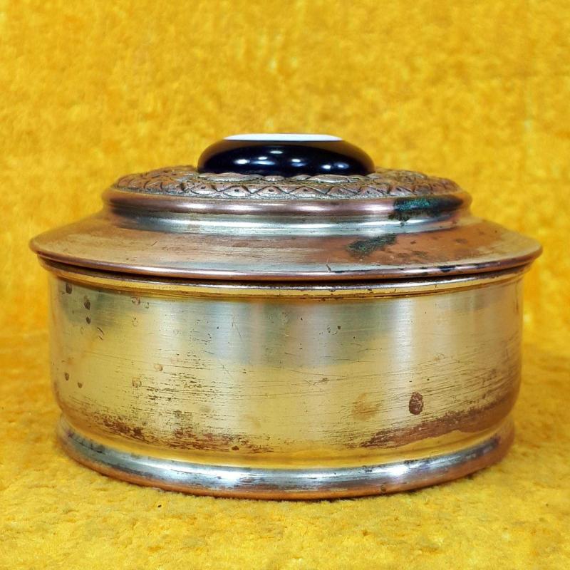 1980 LERDEN . YÜKSEKLİK KAPAK DAHİL 6 cm ÇAP 10,5 cm , KAPLAMALAR KISMEN AŞINMIŞ , DEFORMASYON YOK . KAPAK STİLİZE KABARTMA BİTKİSEL DESENLİ . TEMİZ .