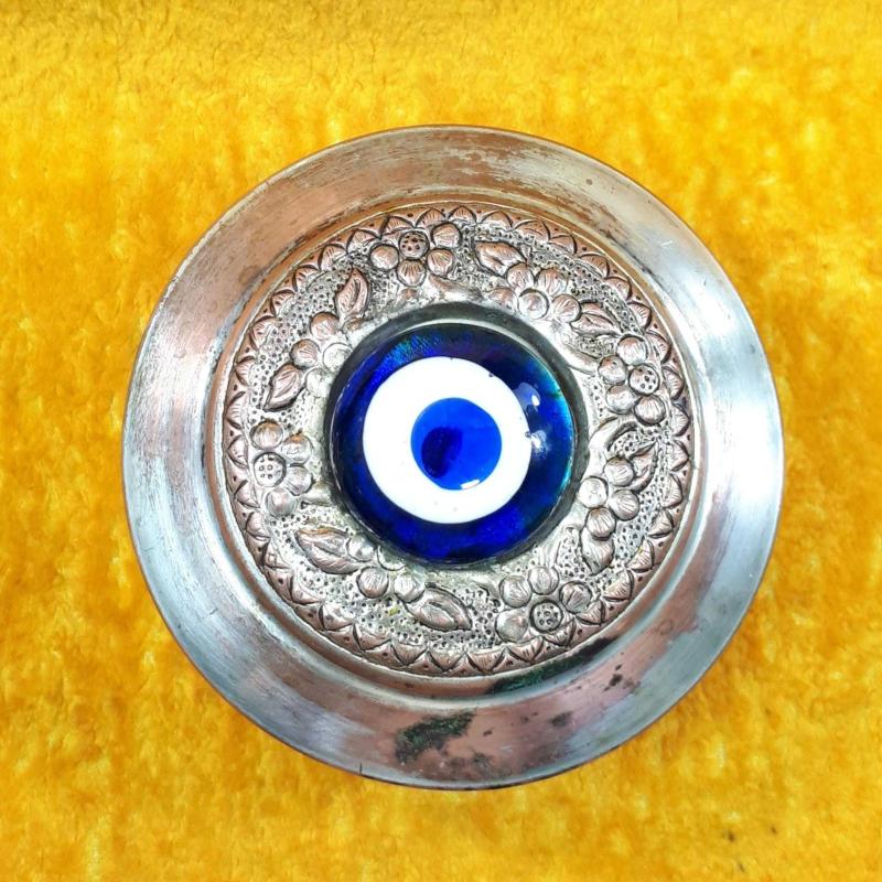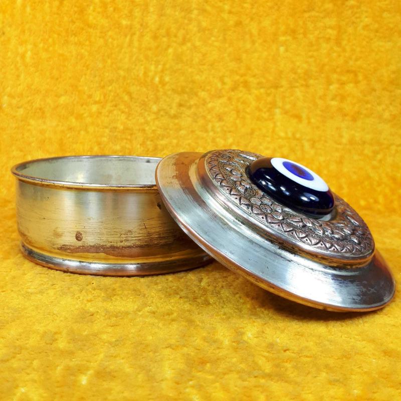 VINTAGE NAZAR BONCUKLU GÜMÜŞ KAPLAMA KAPAKLI YUVARLAK BAKIR KUTU ÇANAK başlıklı antika/koleksiyon objesi Türkiye menşe’lidir. 1980-1999 arası dönemine aittir.