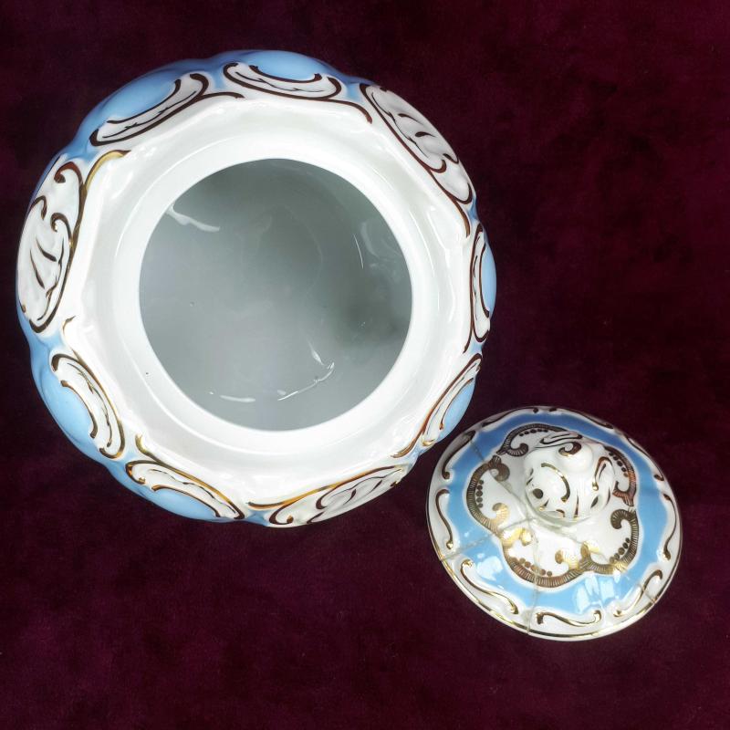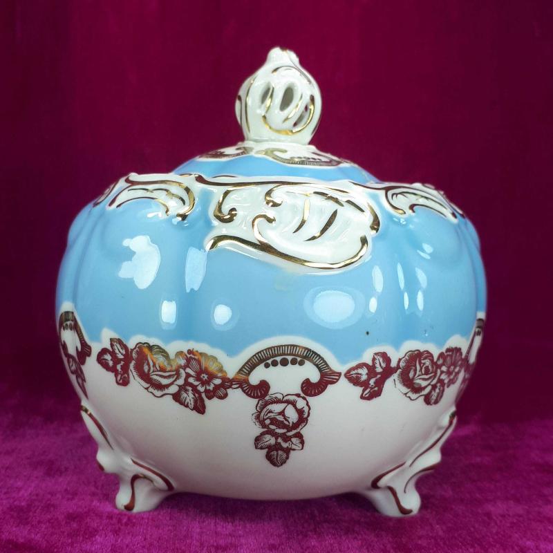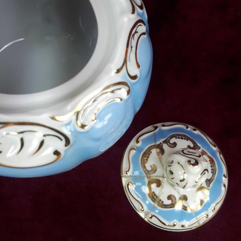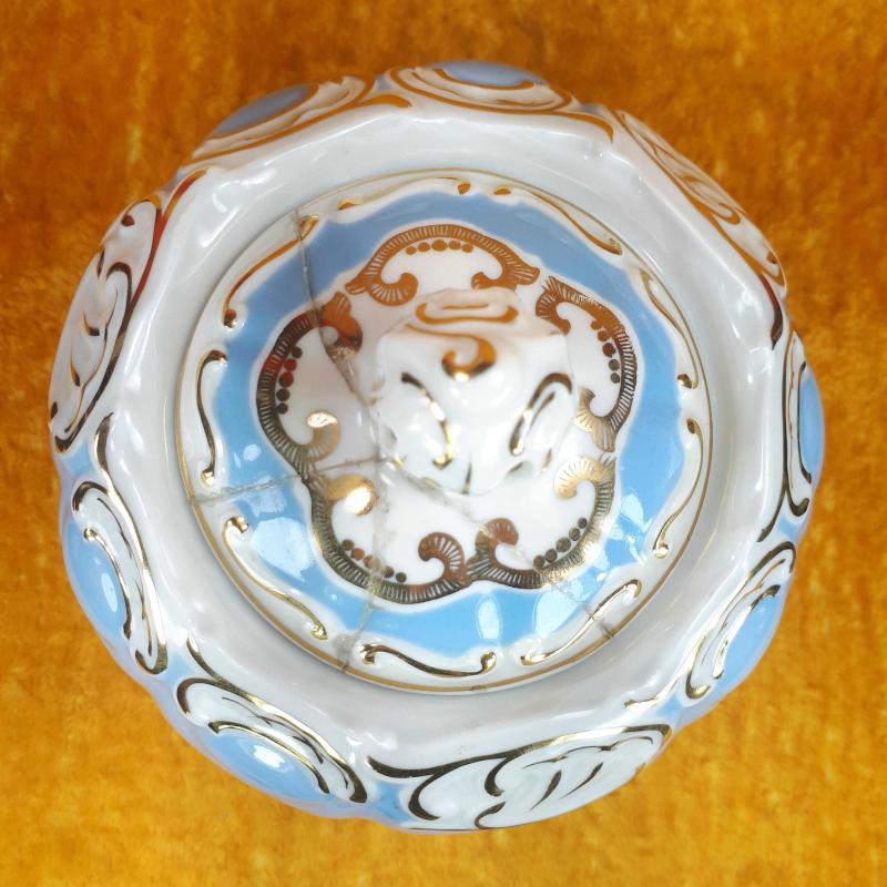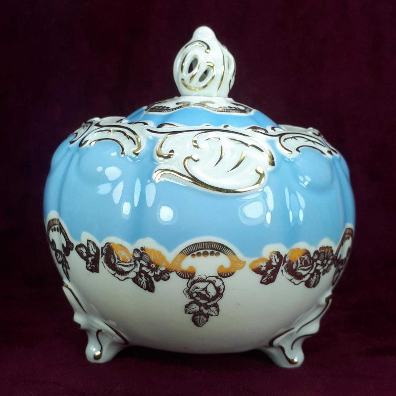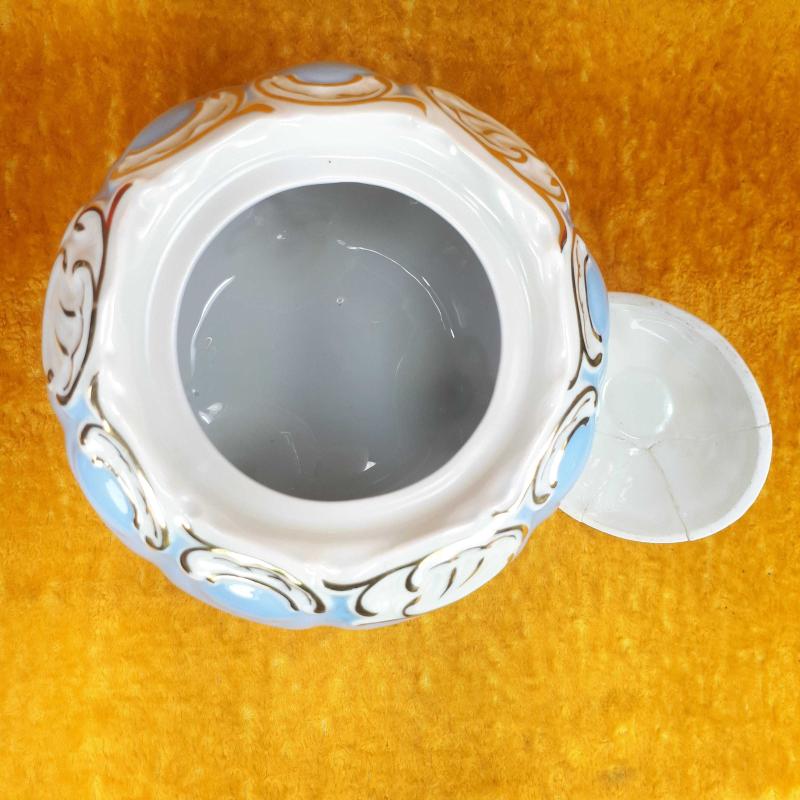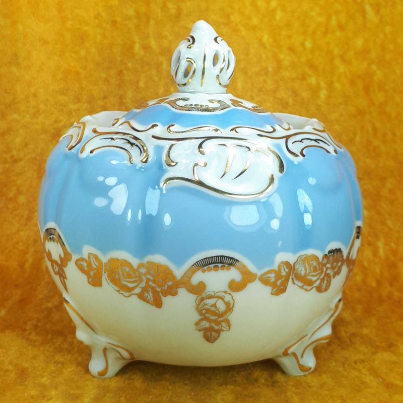1990 LARDAN . KAPAK DAHİL YÜKSEKLİK 14 cm , GÖVDE ÇAPI 13,5 cm . 3 AYAKLI , BEYAZ VE WEDGEWOOD RENKLİ GÖVDE ÜZERİNE SIVAMA EL İŞİ ALTIN YALDIZ ÇİÇEKLER VE STİLİZE BİTKİSEL DEKORLU , KAPAKTA AMATÖRCE YAPIŞTIRILMIŞ 3 PARÇA KIRIK VAR . KULLANIMA ENGEL DEĞİL . DAHA İYİ BİR ŞEKİLDE RESTORE EDİLEBİLİR . BUNUN HARİCİNDE KUSURSUZ .