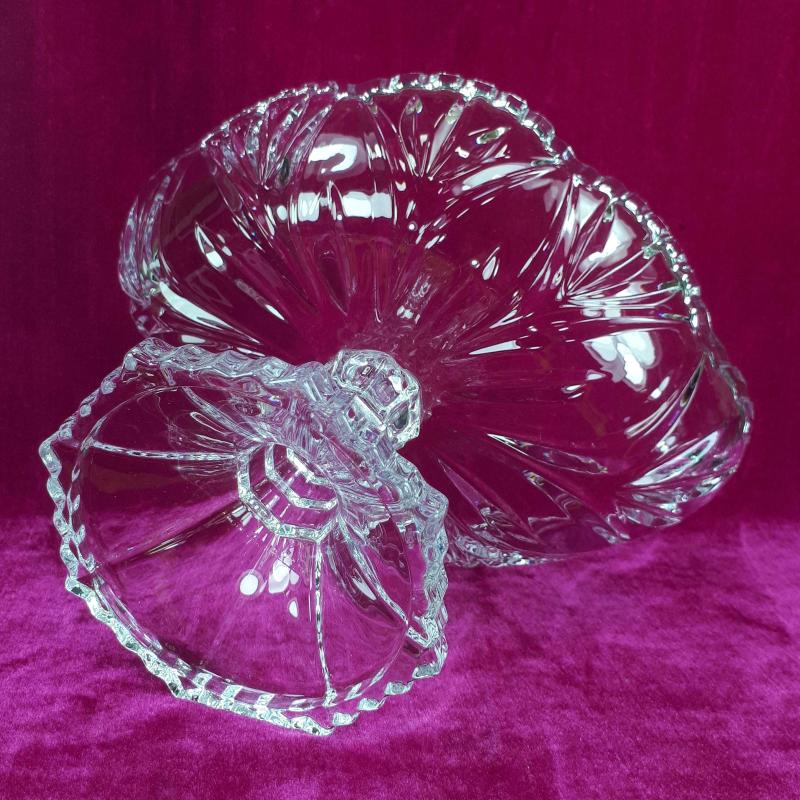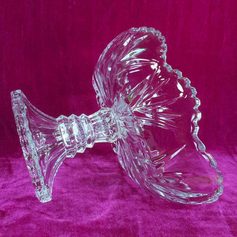 ÜRÜN SIFIR AYARINDADIR . 1990 LARDAN veya 2000 LERDEN . 22,5 x 14 x 17,5 cm . ÇOK YÜKSEK KALİTEDE DÖKME KRİSTAL CAM , KENDİNDEN DERİN BİTKİSEL DESENLİ , KENARLAR VOLANLI VE TIRTIKLI , AYAK 8GEN FORMDA DECO TARZINDA . KUSURSUZ .