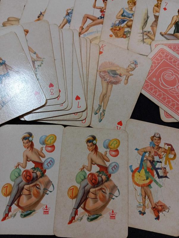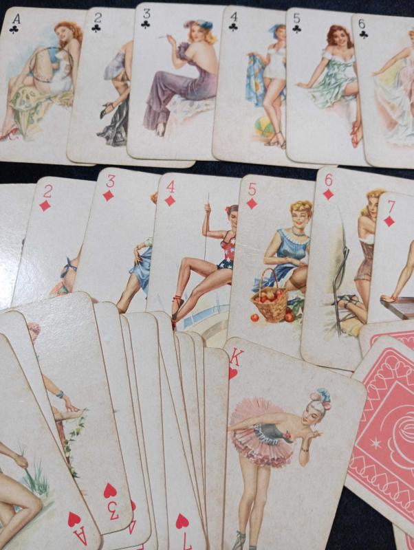 VINTAGE PIN-UP TEMALI İSKAMBİL DESTESİ Özel tasarım, pin-up konseptli iskambil kartı destesi. MACA VALE EKSİK (51 kart +3 jokerler). Tasarım: Koleksiyonluk, retro pin-up baskı Kutu: plastik alt kısmı Mevcut Kartlarda geneli iyi durumda bir ikisinde az yıpranma var Koleksiyon yapanlar ve özel tasarım deste arayanlar için uygundur. başlıklı antika/koleksiyon objesi Türkiye menşe’lidir. Objenin ait olduğu dönem bilinmeketedir.
